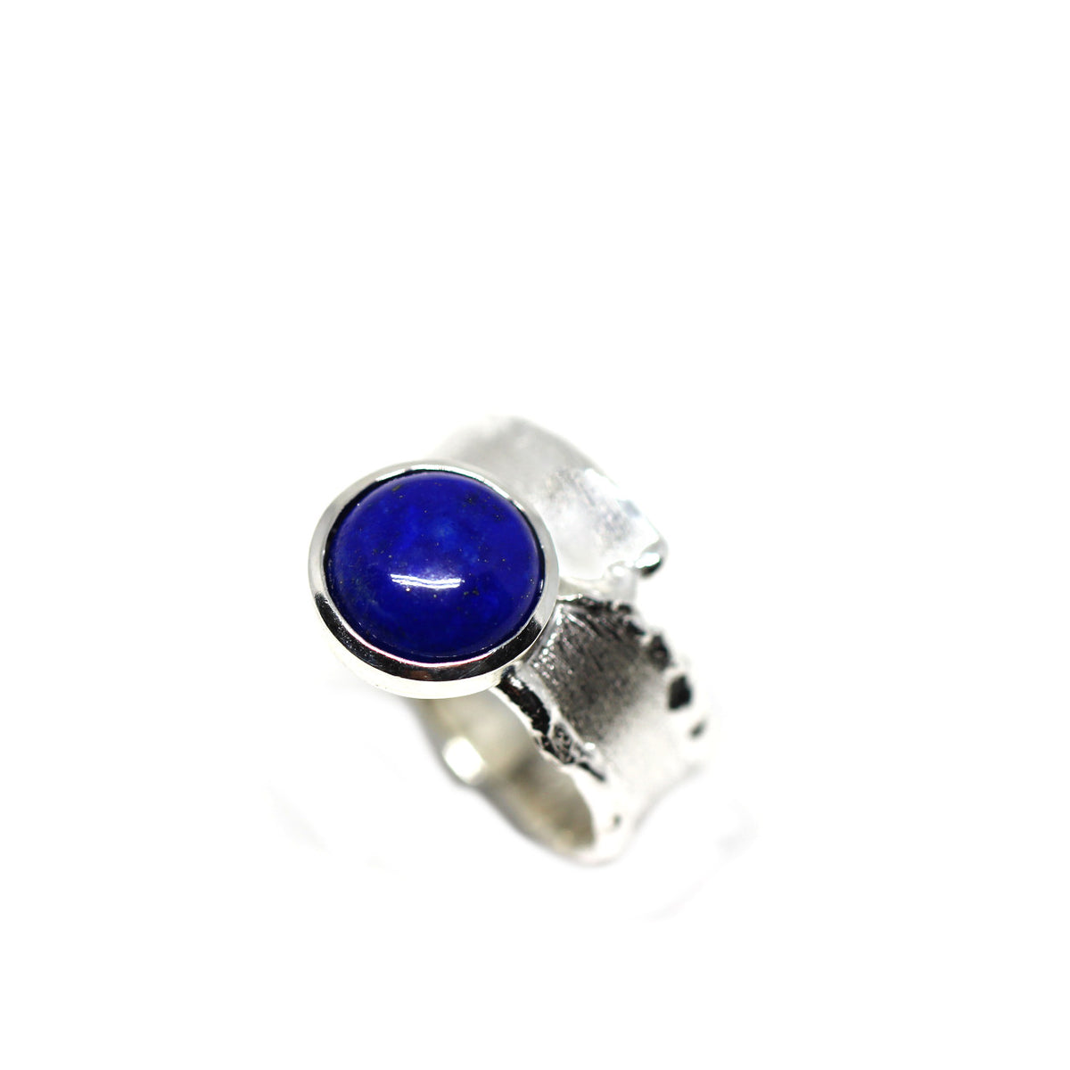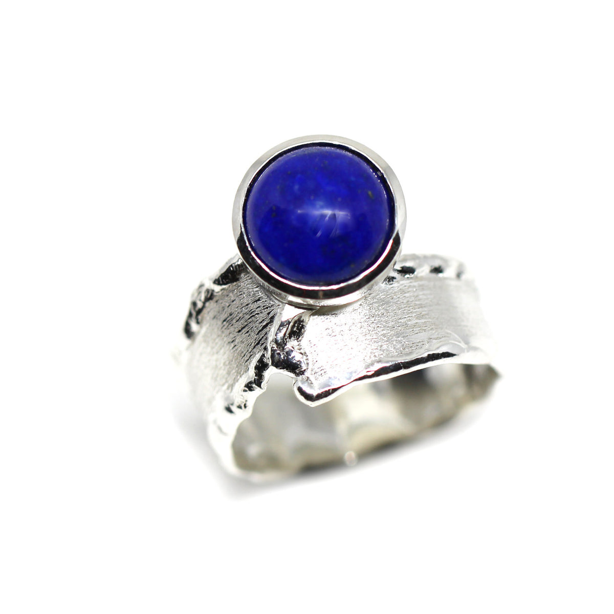 Ansprechender Ring aus 925 Sterlingsilber der in unserer Werkstatt hergestellt wurde. Den Mittelpunkt gestaltet ein einzigartiger Lapislazuli. Vor allem zu dem Silber sieht der kobaltblaue Stein edel aus. Ein weiterer Blickfang ist die schöne Struktur die wir in das Metall eingearbeitet haben. Dadurch bekommt dieses Stück noch mehr Kreativität.