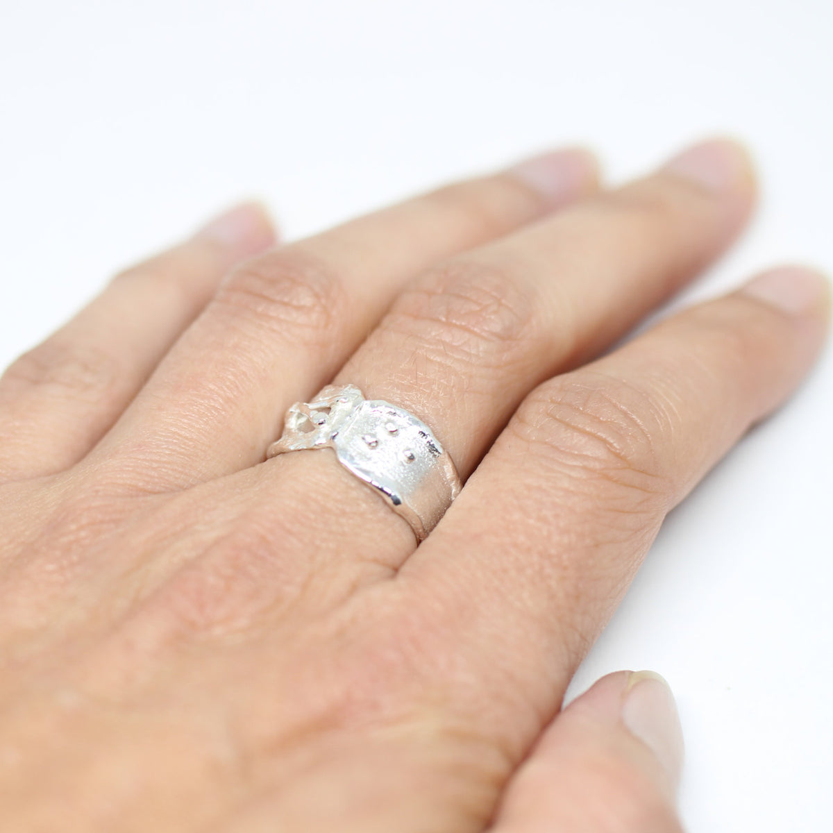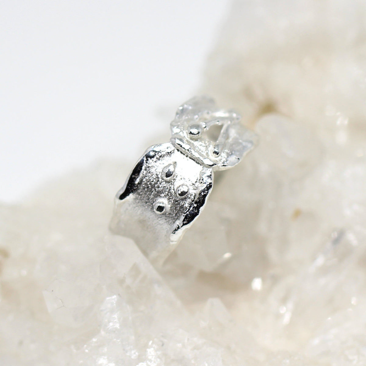Eines unserer neusten Entwürfe ist dieses tolle Schmuckstück. Es handelt sich um einen aus 925er Sterlingsilber angefertigten Ring. Wir haben ihn selbst designed und in unserer kleinen Goldschmiede angefertigt. Das Besondere ist unsere spezielle Struktur die den Ring zu einem echten Blickfang werden lässt.