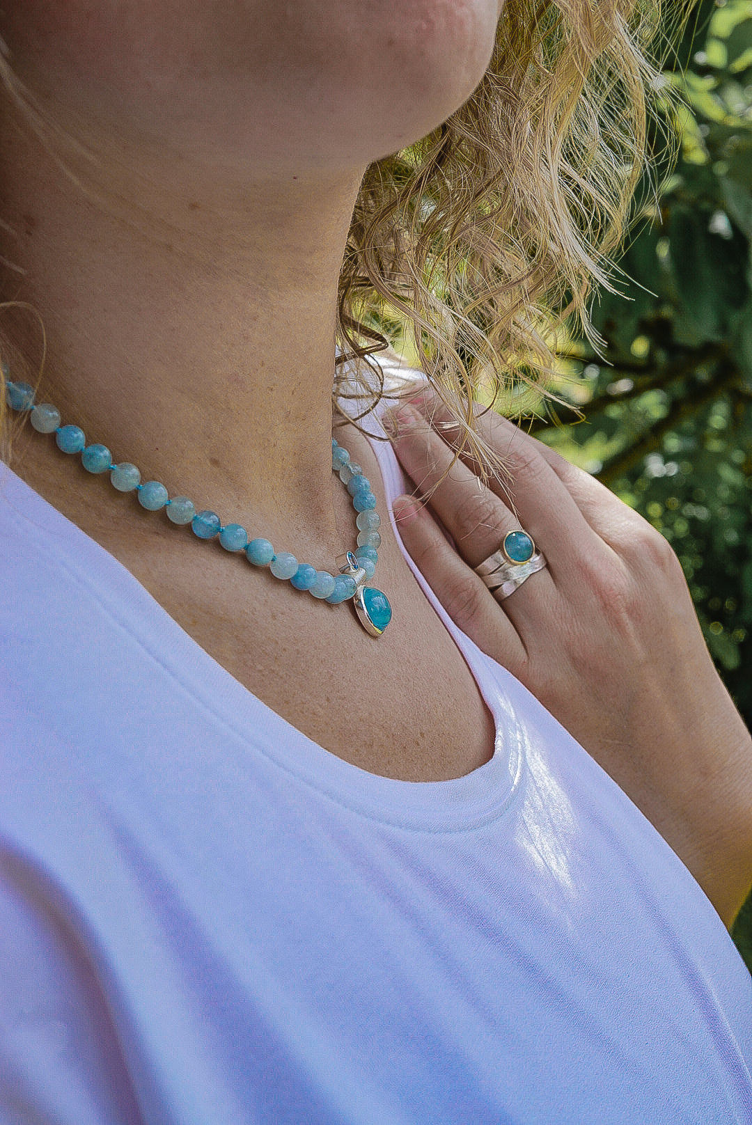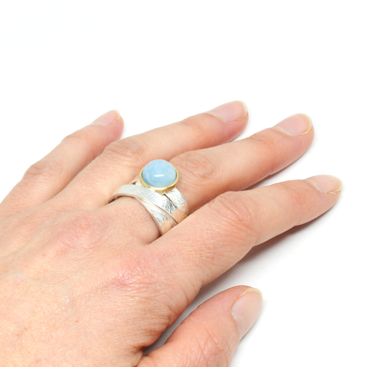 Toller Ring aus 925er Sterlingsilber der in unserer Werkstatt hergestellt wurde. Den Mittelpunkt schmückt ein Aquamarinstein. Wie der Name des Steines schon verrät erinnert die Farbe an Wasser. Vor allem zu dem Silber sieht der Aquamarin sehr edel aus. Eingefasst haben wir ihn in 750er Gelbgold. Ein weiterer Blickfang ist die schöne Struktur die wir in das Metall eingearbeitet haben. Dadurch bekommt dieses Stück noch mehr Kreativität.