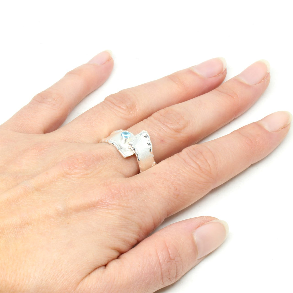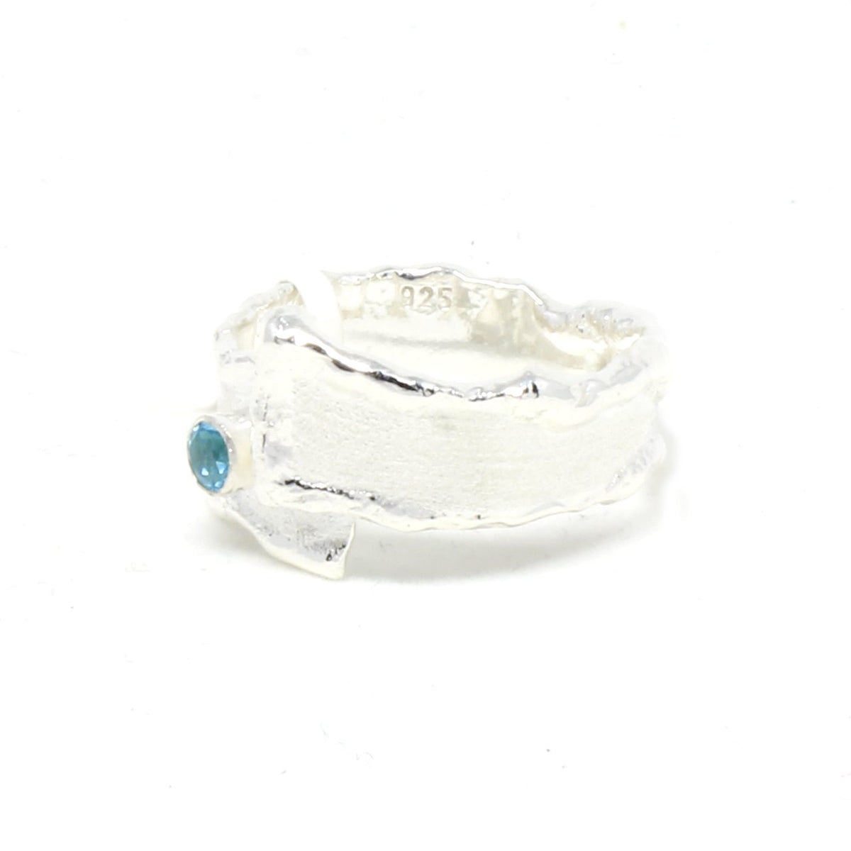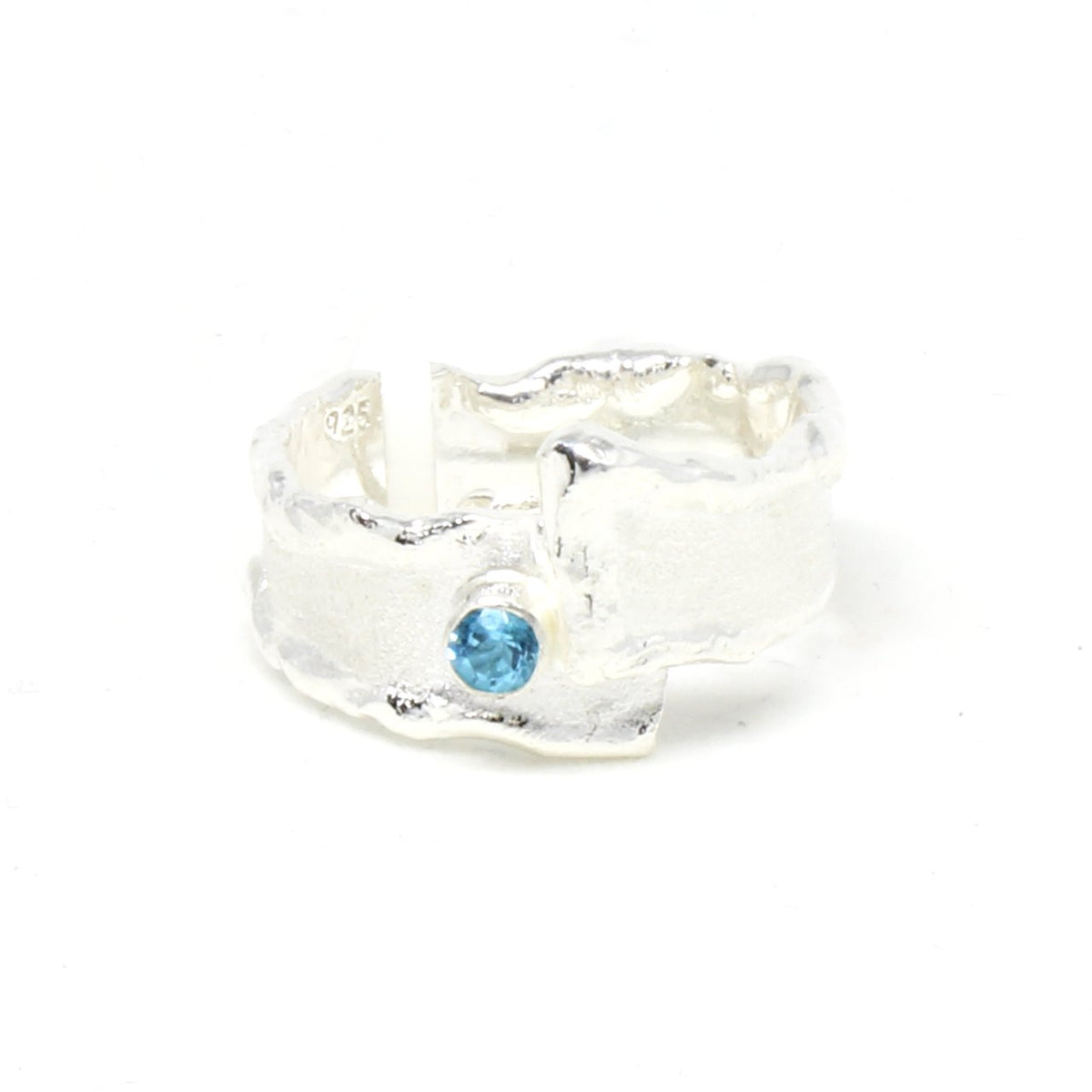 Eines unserer neusten Entwürfe ist dieses tolle massive Schmuckstück. Es handelt sich um einen aus 925er Sterlingsilber angefertigten Ring. Wir haben ihn in unserer kleinen Goldschmiede hergestellt. Das Besondere ist die spezielle Oberflächenstruktur, welche den Ring zu einem handwerklichen Klassiker werden lässt. Ein strahlender Blautopas verleiht ihm Eleganz.