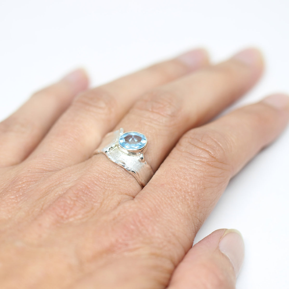 Eines unserer neusten Entwürfe ist dieses tolle massive Schmuckstück. Es handelt sich um einen aus 925er Sterlingsilber angefertigten Ring. Wir haben ihn in unserer kleinen Goldschmiede hergestellt. Das Besondere ist die spezielle Oberflächenstruktur, welche den Ring zu einem handwerklichen Klassiker werden lässt. Ein strahlender Blautopas verleiht ihm Eleganz.