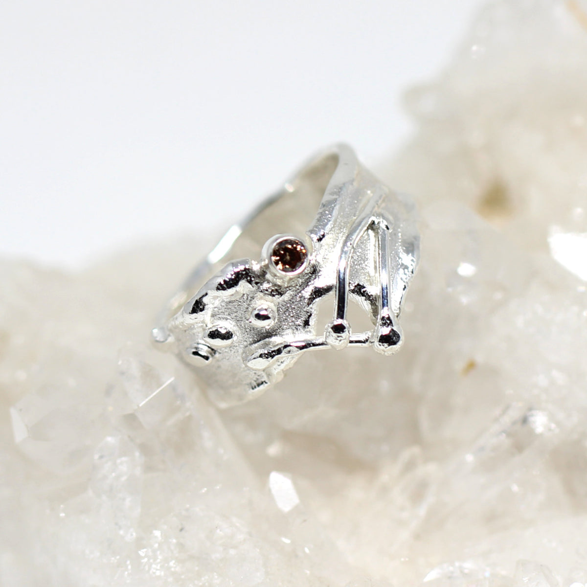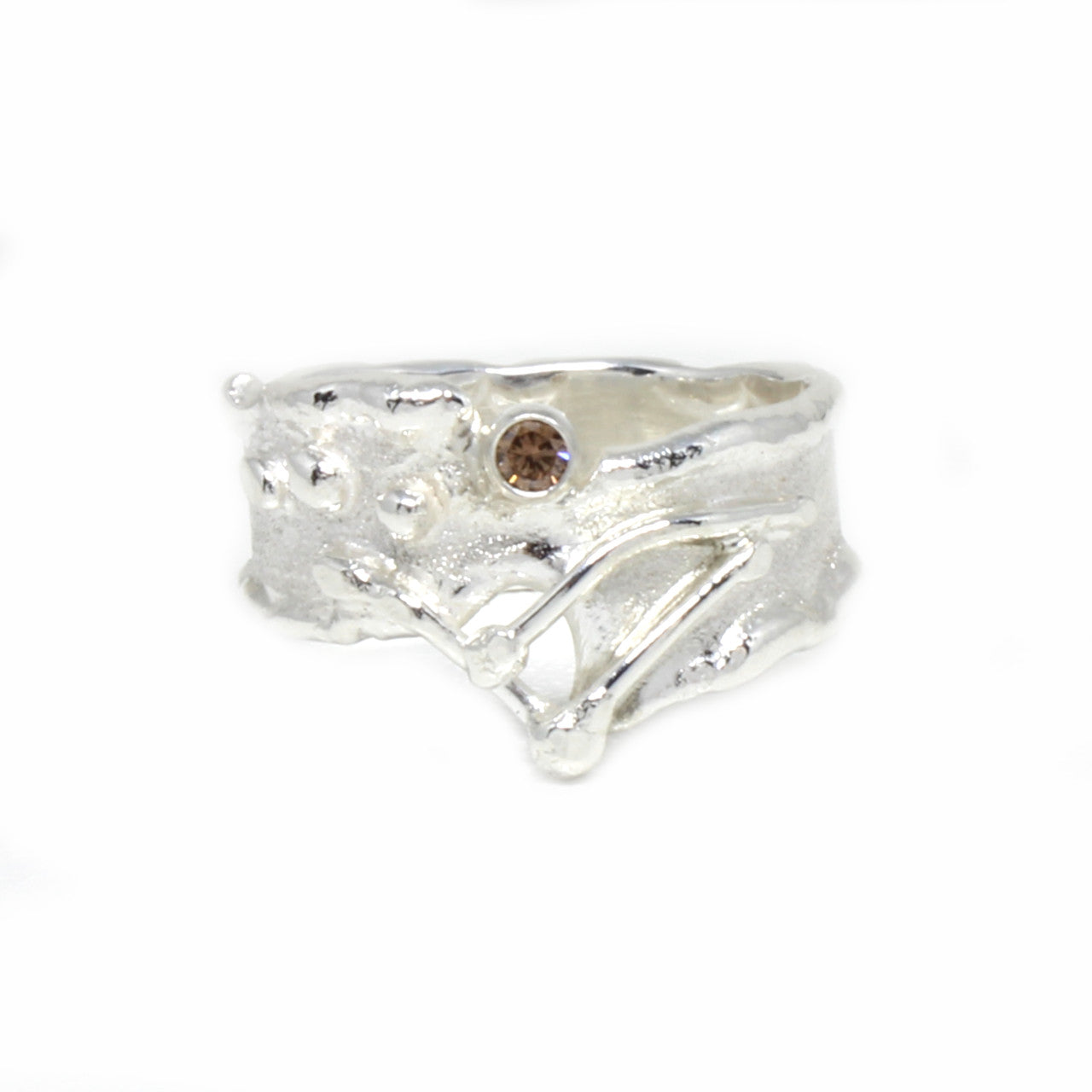 Tragen Sie ein Stück modernster Kreativität. Bei diesem einzigartigen Stück aus unserer eigenen Kollektion treffen Raffinesse und verspielte Handwerkskunst aufeinander. Das zusammentreffen von poliertem und mattiertem 925er Sterlingsilber verleihen ihm den letzten Schliff. Zudem funkelt Ihnen ein kleiner champagner farbener Brillant entgegen der diesen Ring zu einer edlen Besonderheit macht.