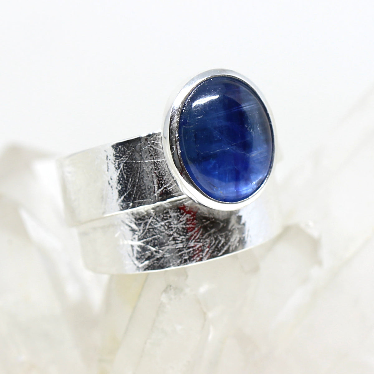Toller Ring aus 925er Sterlingsilber der in unserer Werkstatt hergestellt wurde. Den Mittelpunkt schmückt ein schillernder Disthen. Vor allem zu dem Silber sieht der Disthen mit seinem intensiven Blau sehr edel aus. Ein weiterer Blickfang ist die schöne Struktur, die wir in das Metall eingearbeitet haben. Dadurch erhält dieses Stück noch mehr Kreativität.