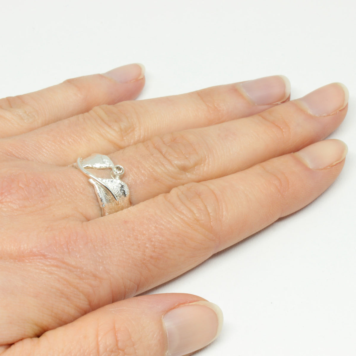 Tragen Sie ein Stück modernster Kreativität. Bei diesem einzigartigen Stück aus unserer eigenen Kollektion treffen Raffinesse und verspielte Handwerkskunst aufeinander. Das zusammentreffen von poliertem und mattiertem 925er Sterlingsilber verleihen ihm den letzten Schliff. Zudem funkelt Ihnen ein kleiner champagner farbener Brillant entgegen der diesen Ring zu einer edlen Besonderheit macht.