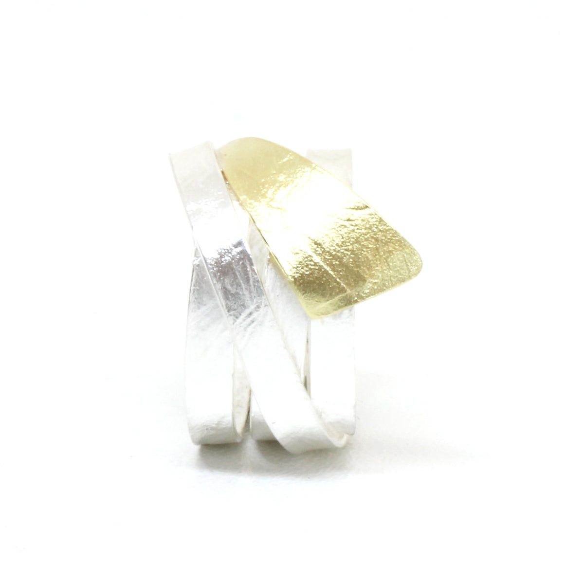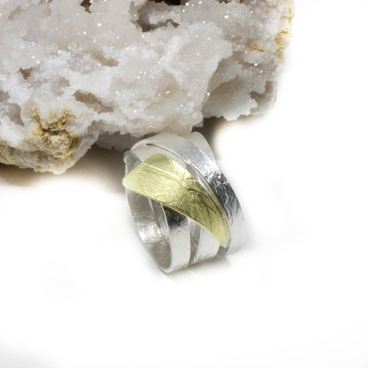 Dieses schöne Schmuckstück haben wir in unserer kleinen Goldschmiede hergestellt. Das Grundmaterial dieses Ringes ist 925er Sterlingsilber, das wir zum Teil mit 750er Gelbgold bearbeitet haben. Somit haben wir ein trendiges Stück gearbeitet das man hervorragend zu Silber und Goldschmuck tragen kann.