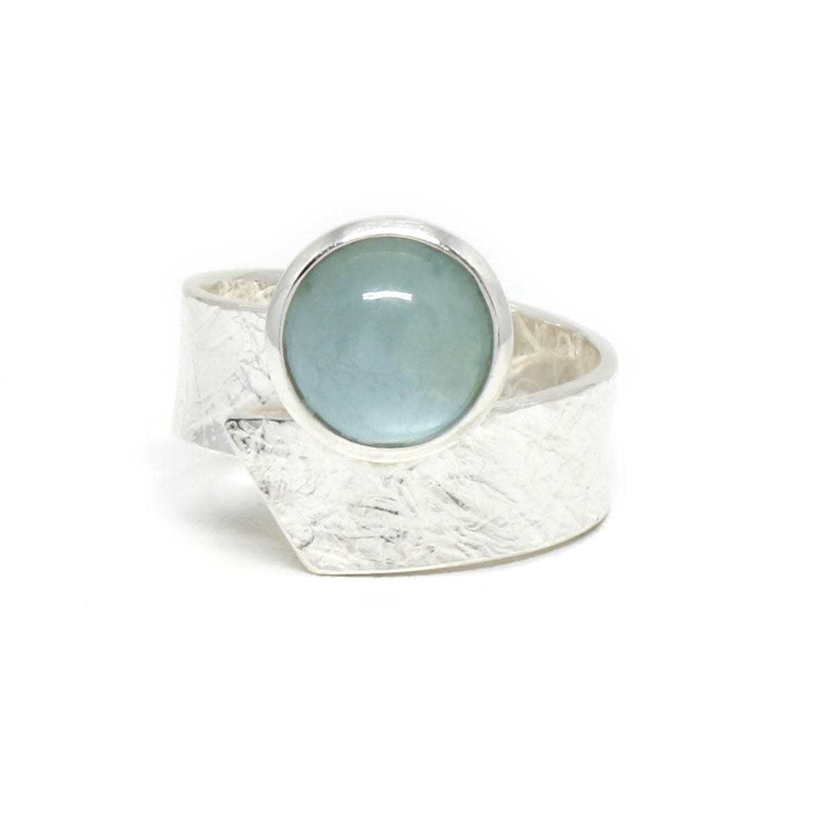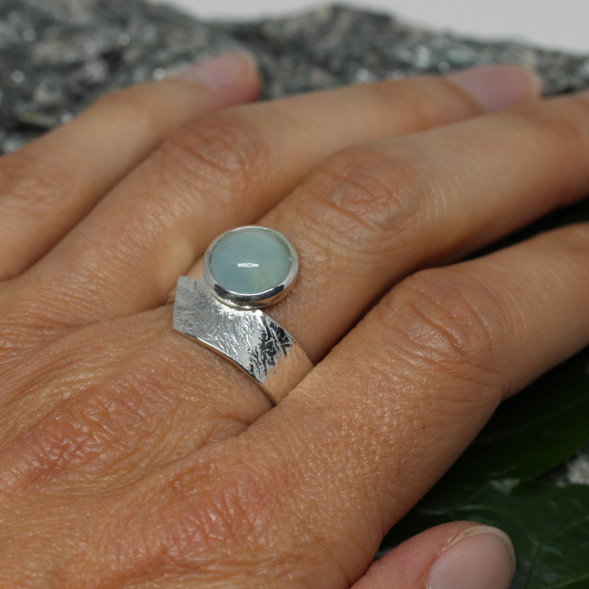 Toller Ring aus 925er Sterlingsilber der in unserer Werkstatt hergestellt wurde. Den Mittelpunkt schmückt ein Aquamarinstein. Wie der Name des Steines schon verrät erinnert die Farbe an Wasser. Vor allem zu dem Silber sieht der Aquamarin sehr edel aus. Ein weiterer Blickfang ist die schöne Struktur die wir in das Metall eingearbeitet haben. Dadurch bekommt dieses Stück noch mehr Kreativität.