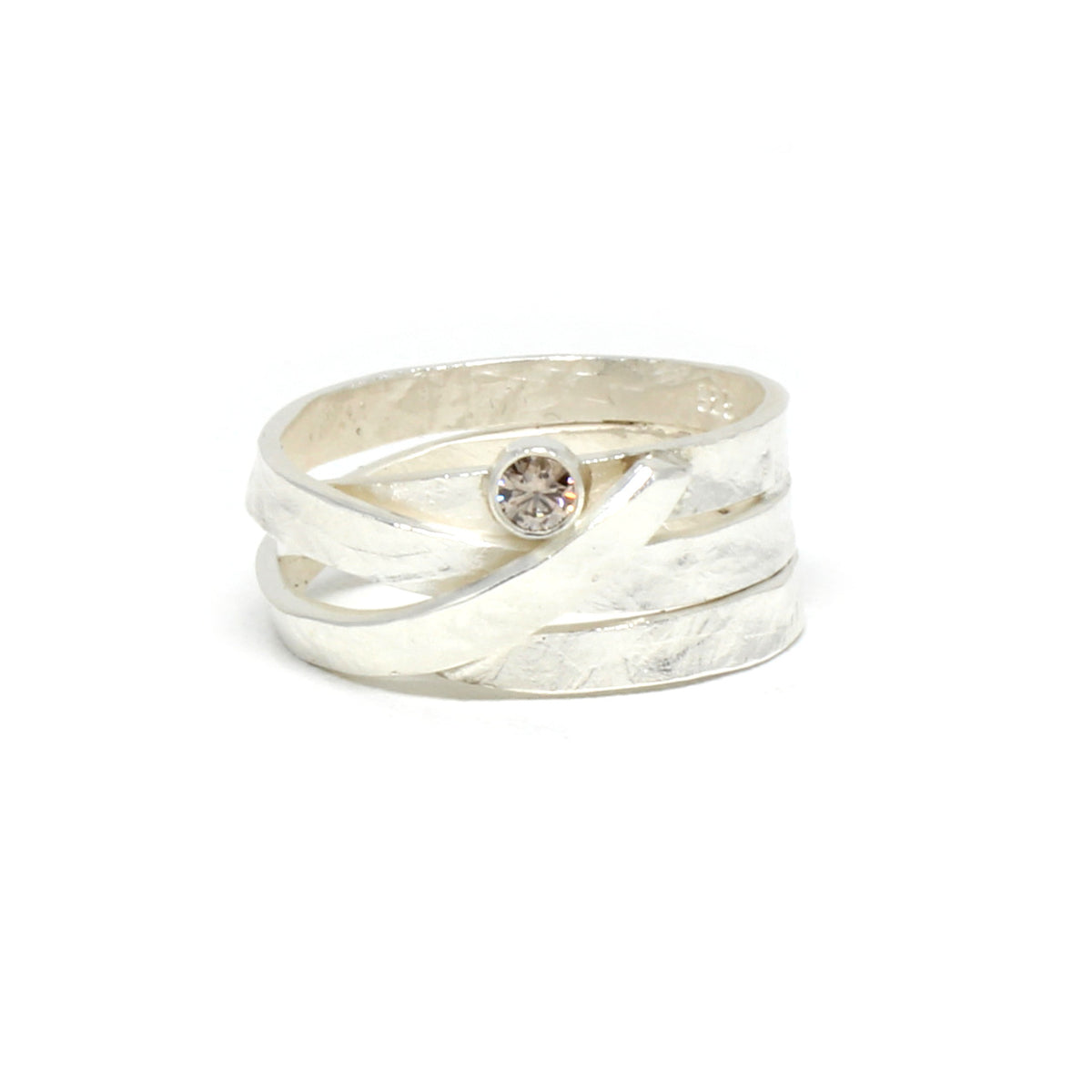 Tragen Sie ein Stück modernster Kreativität. Bei diesem einzigartigen Stück aus unserer eigenen Kollektion treffen Raffinesse und verspielte Handwerkskunst aufeinander. Die spezielle Oberflächenstruktur und der funkelnde, champagner farbene Brilliant verwandeln diesen Ring aus 925er Sterlingsilber in eine edle Besonderheit.