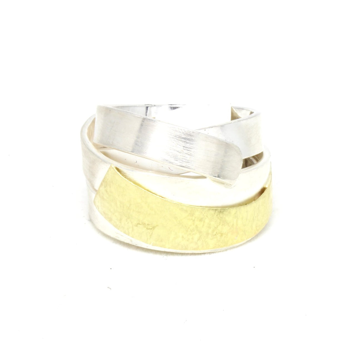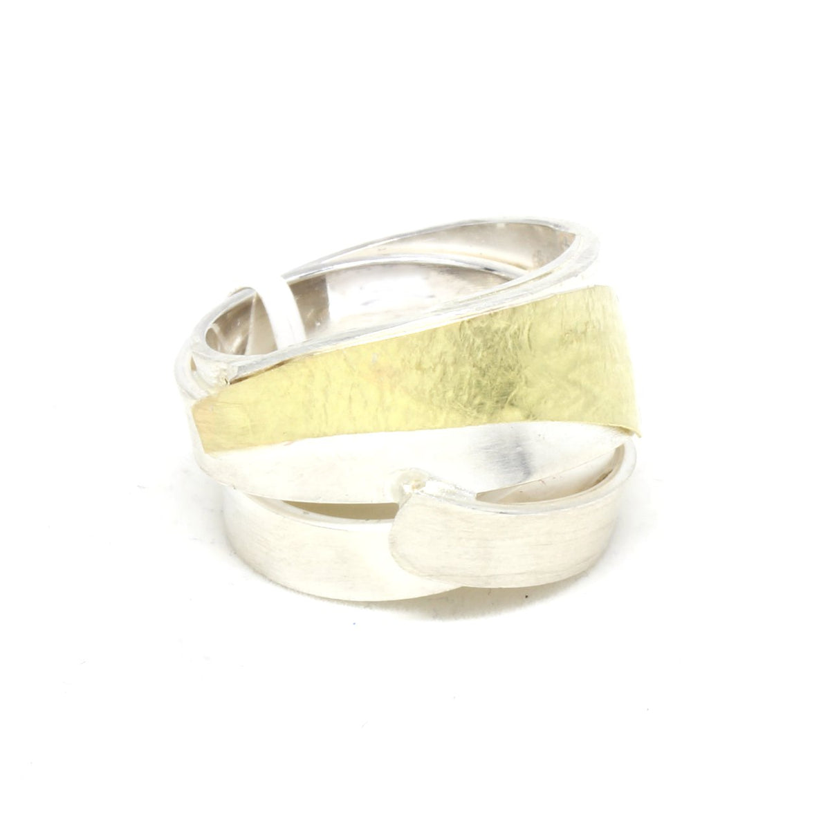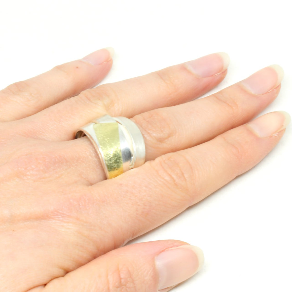 Dieses schöne Schmuckstück haben wir in unserer kleinen Goldschmiede hergestellt. Das Grundmaterial dieses Ringes ist 925er Sterlingsilber, das wir zum Teil mit 750er Gelbgold bearbeitet haben. Somit haben wir ein trendiges Stück gearbeitet das man hervorragend zu Silber und Goldschmuck tragen kann. Die Silberne Seite arbeiteten wir dabei mit einer anderen Oberflächenstruktur als das Gold, um noch einen deutlicheren Kontrast zu schaffen.