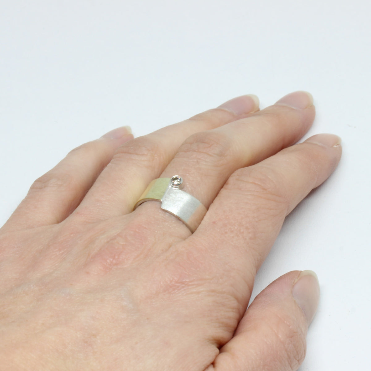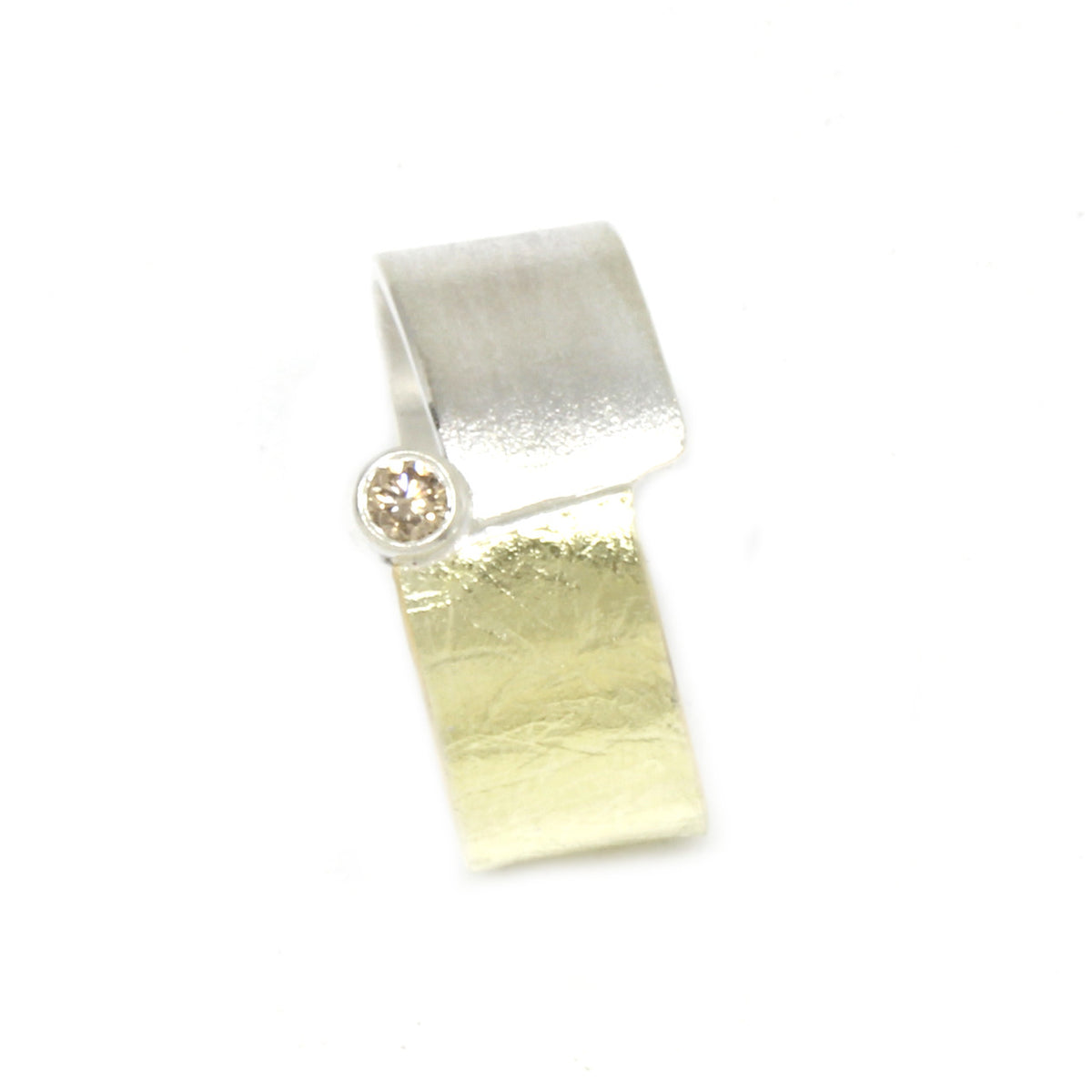 Eleganter Ring in malerischer Optik. Bei diesem aparten Schmuckstück haben wir 925er Silber mit 750er Gelbgold vereint. Somit haben wir ein trendiges Stück hergestellt das man hervorragend zu Silber und Goldschmuck tragen kann. Als weiteren Höhepunkt haben wir einen funkelnden champagner farbenen Brillanten eingefasst.