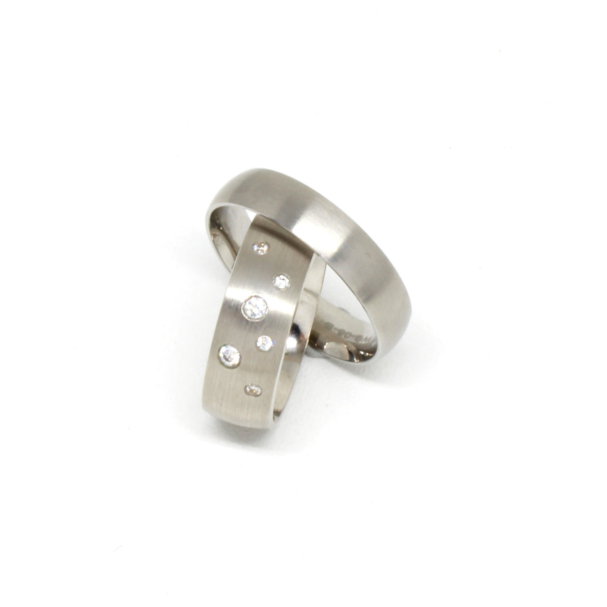 Schöne Trauringe mit Besonderheit. Diese liegt bei dem wunderschönen Damenring. Wir haben diesen mit einem sogenannten Sternenhimmel aus Brillanten hergestellt. Bei diesem Ring kann man für jedes Ehejahr oder die Geburt eines Kindes weitere Steine einarbeiten. Dies lässt den Ring zu etwas besonderem werden bei dem jedes Lebensereignis seinen Platz findet. Den Herrenring haben wir im Gegenzug klassisch gehalten und die Oberfläche beider Ringe mattiert.