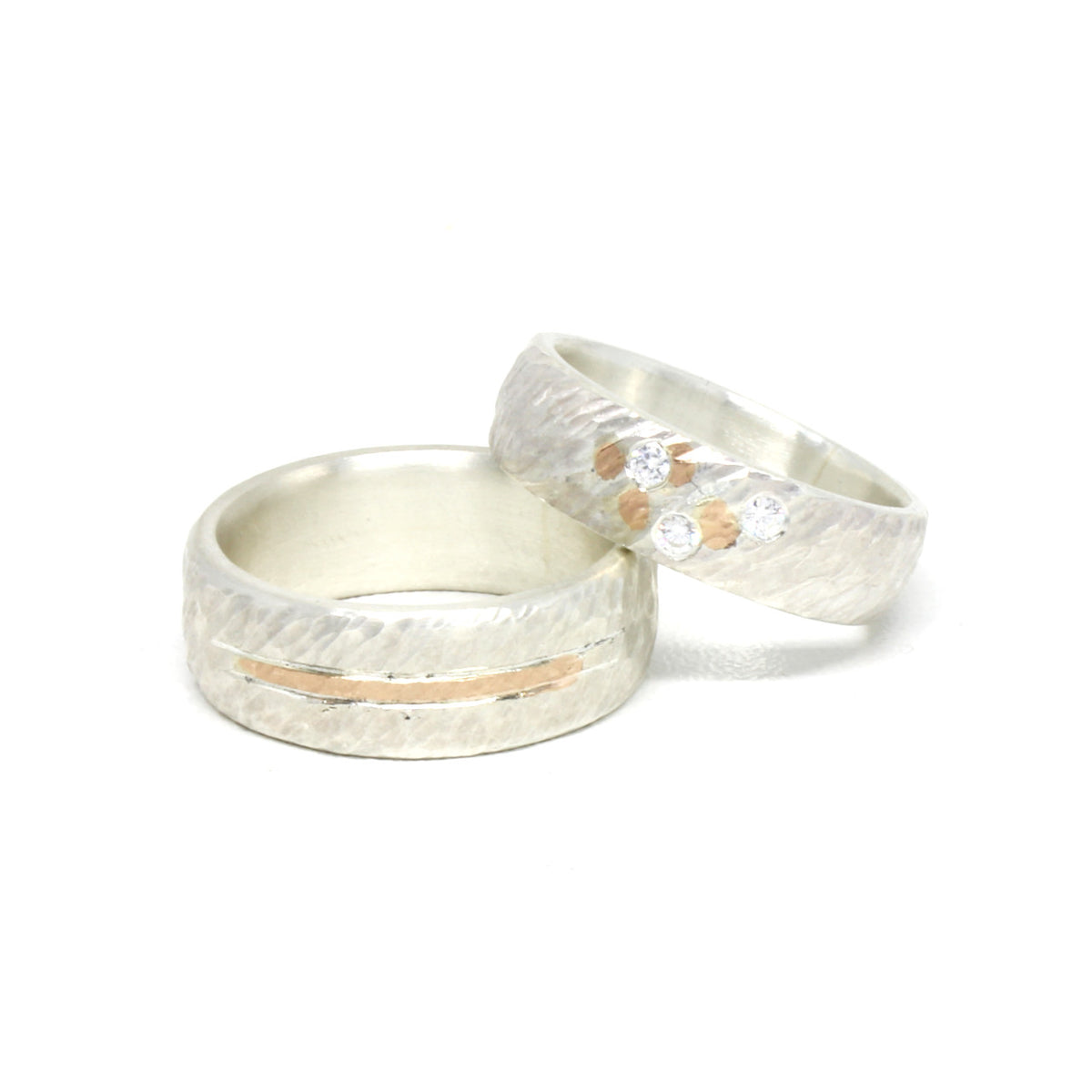 Diese neuen Modelle haben wir in einer besonderen Technik gearbeitet. Die Trauringe sind aus 925er Sterlingsilber, massiv hergestellt. Elemente aus 585er Rotgold ziehen sich dezent durch das Sterlingsilber. Die Ringe sind in Zieroptik geschmiedet und mattiert. Der Damenring trägt drei kleine Zirkonia. Bei diesem Muster sieht man deutlich das es sich um handgefertigte Trauringe handelt!