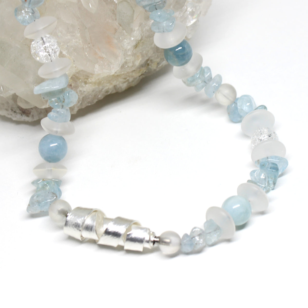 Diese zauberhafte Wechselkette haben wir selbst zusammen gestellt. Wir haben uns hier für Aquamarin und Bergkristall entschieden. Diese Farben harmonieren perfekt miteinander und lassen sich sehr gut kombinieren.