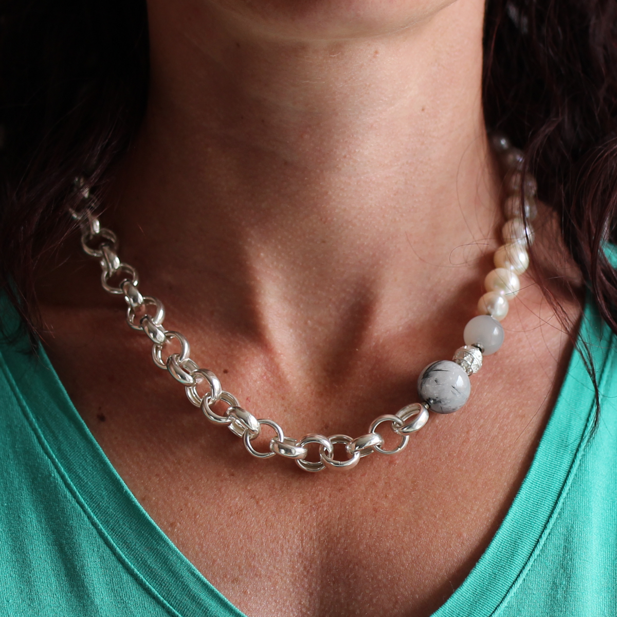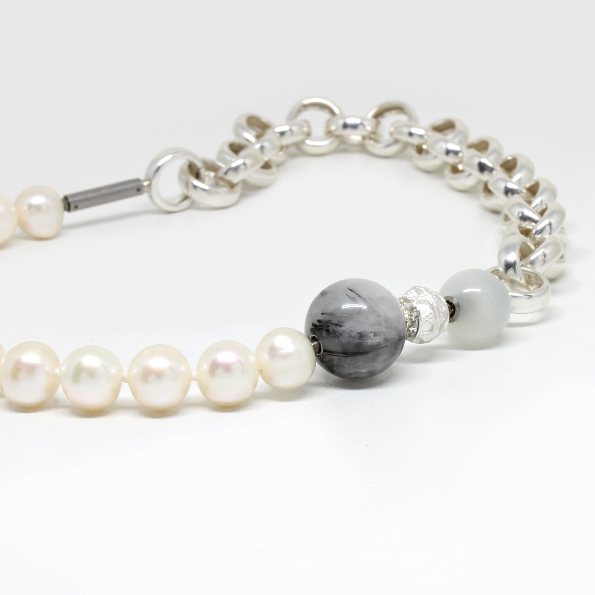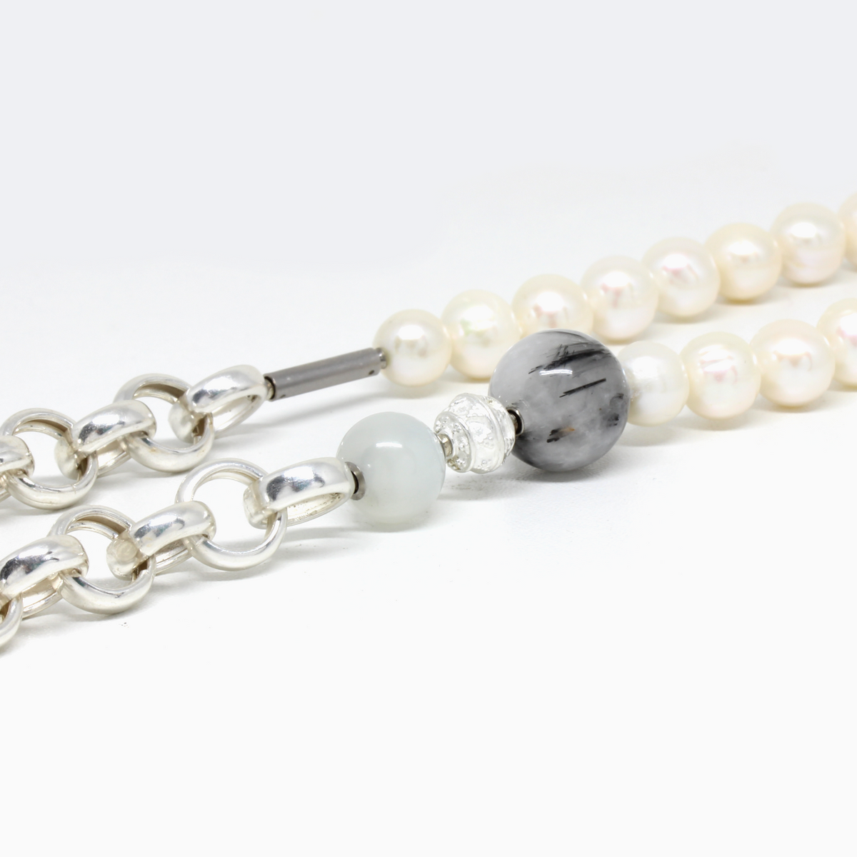 Tragen Sie eine einzigartige Kreation aus edlem 925 Sterlingsilber und exquisiten Süßwasserperlen. Das aufregende Zusammenspiel der Materialien wird getoppt mit Ihrer freien Kreation an Wechselschließen. Sie benötigen hierfür mindestens zwei Wechselschließen um die beiden Kettenelemente zu verbinden. Um Ihre gewünschte Kettenendlänge zu erhalten können Sie zudem sehr gut mit Adaptern arbeiten. Dieses Silberteil je nach Länge kann man auch als Armband tragen!