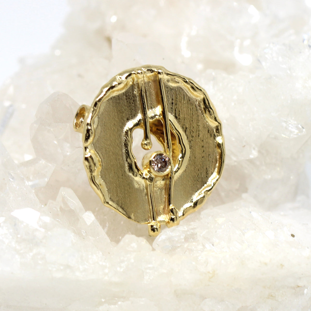 Diese Wechselschließe zeigt sich klar im Stil von Schmuckwiedu. Mit der Handarbeit setzt das Schmuckstück einen eigenen Trend welcher stets modern bleibt. Die Abwechslung zwischen unterschiedlichen Oberflächenstrukturen zeigt einen edlen Kontrast. Wir haben die Schließe in unserer Goldschmiede hergestellt und als Material 333er Gelbgold verwendet. Als Blickfang haben wir einen champagner farbenen Brillanten eingefasst.