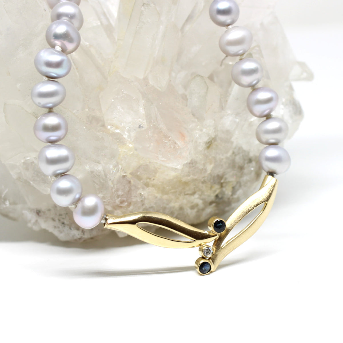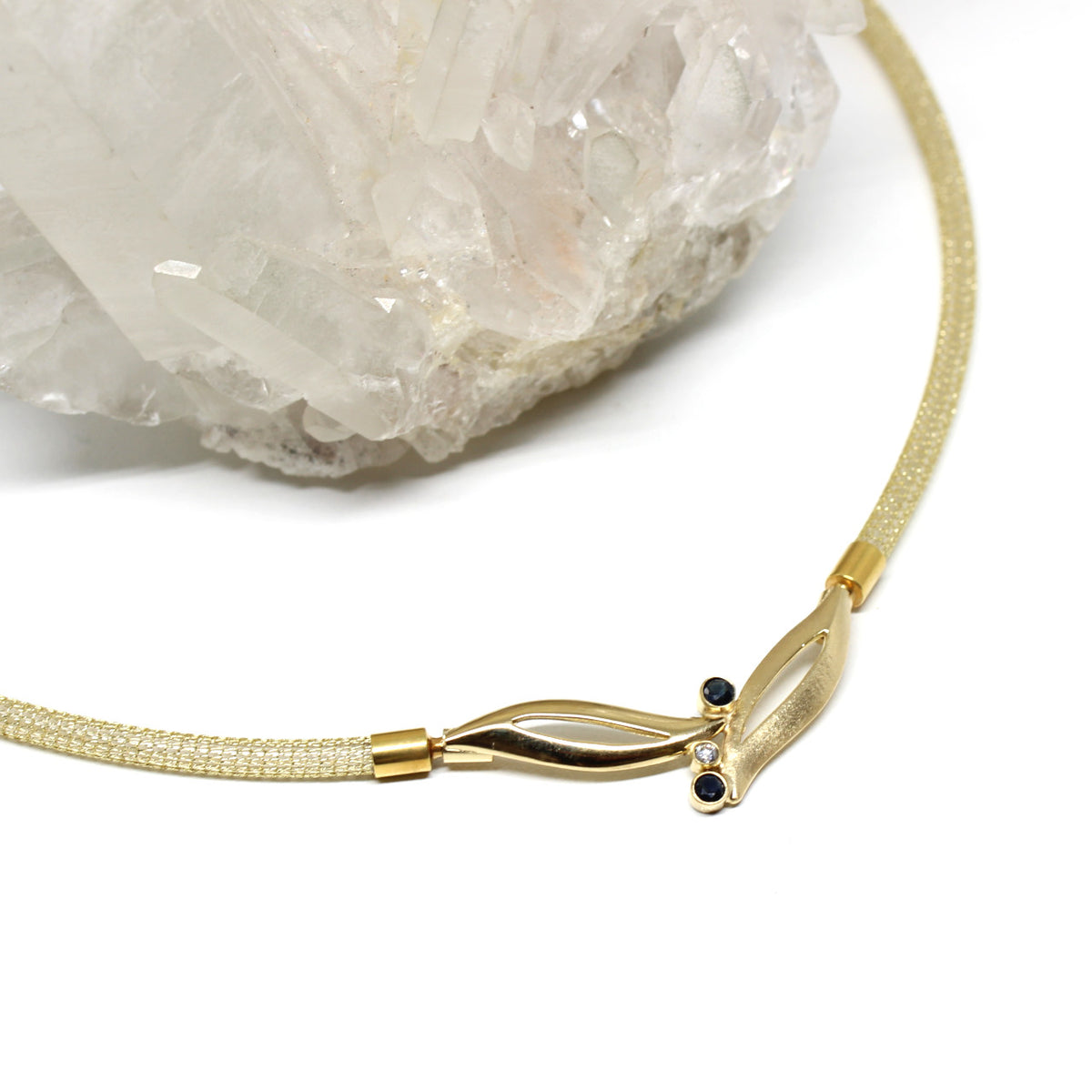 Diese feine Wechselschließe ist genau das richtige für Liebhaber der dezenten Schmuckstücke. Die Schließe erinnert an zarte Blüten und ist auch vom Gewicht her sehr angenehm. Gefertigt ist sie aus 333er Gelbgold. Zwei blaue Saphire und ein weißer Zirkonia runden das ganze ab.
