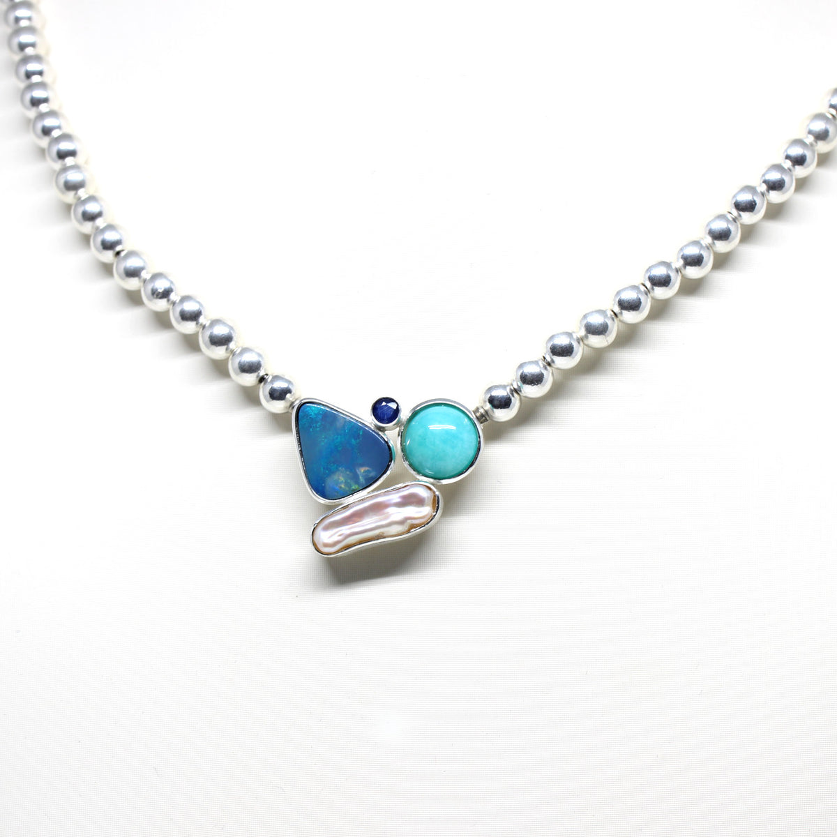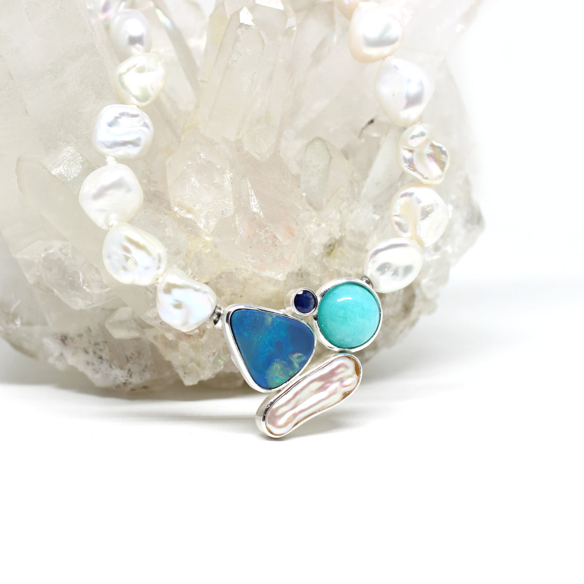 Ein echter Blickfang stellt diese handgefertigte Wechselschließe dar. Der hochwertige Opal strahlt in einem besonderen Farbton welcher von Blau- und Grüntönen durchzogen ist. Um den blauen Farbton aufzugreifen haben wir einen blauen Saphir und einen türkisen Amazonit eingebunden. Eine weiße Süßwasserperle bildet den feinen Kontrast zu den bunten Edelsteinen. Eingefasst haben wir alles in 925er Sterlingsilber.