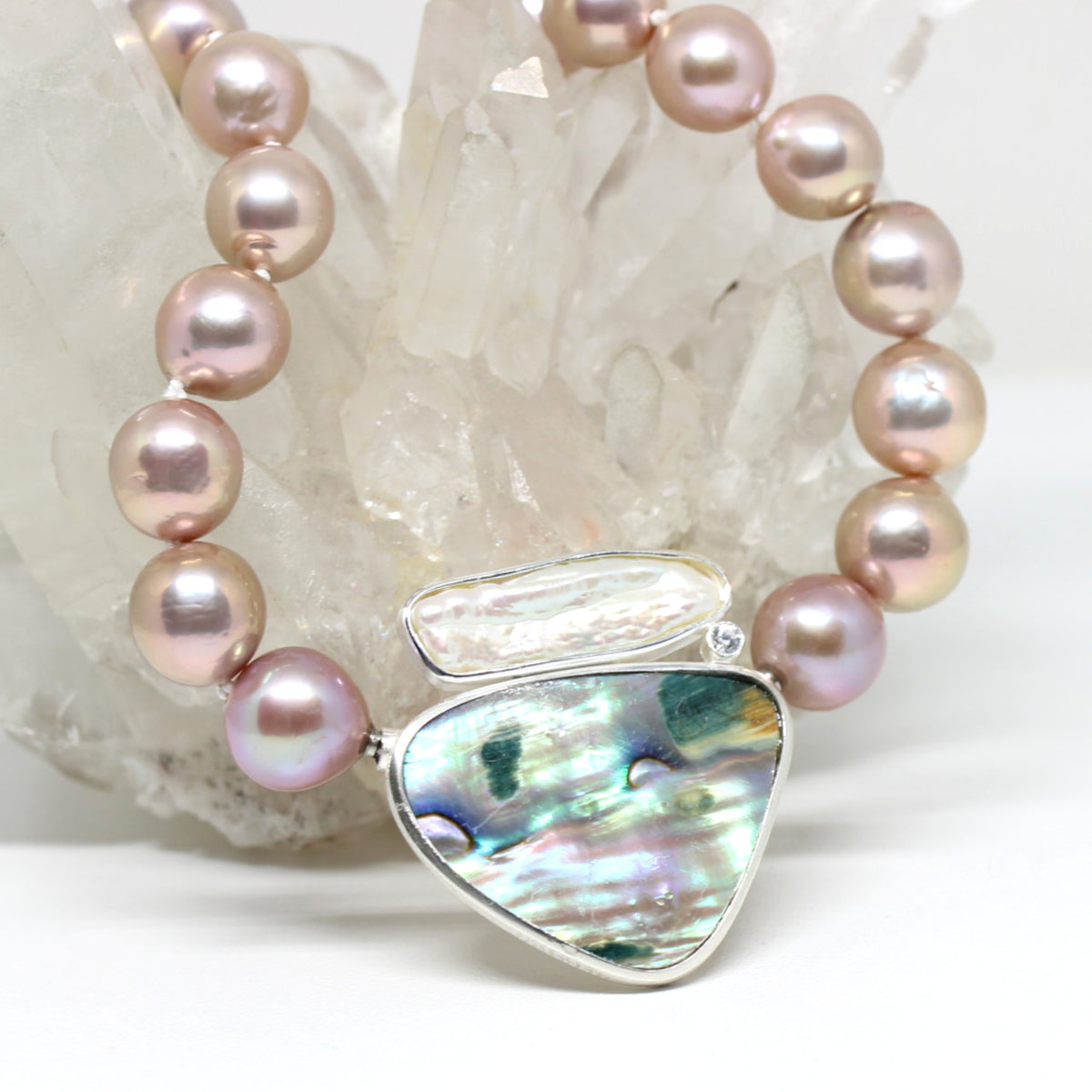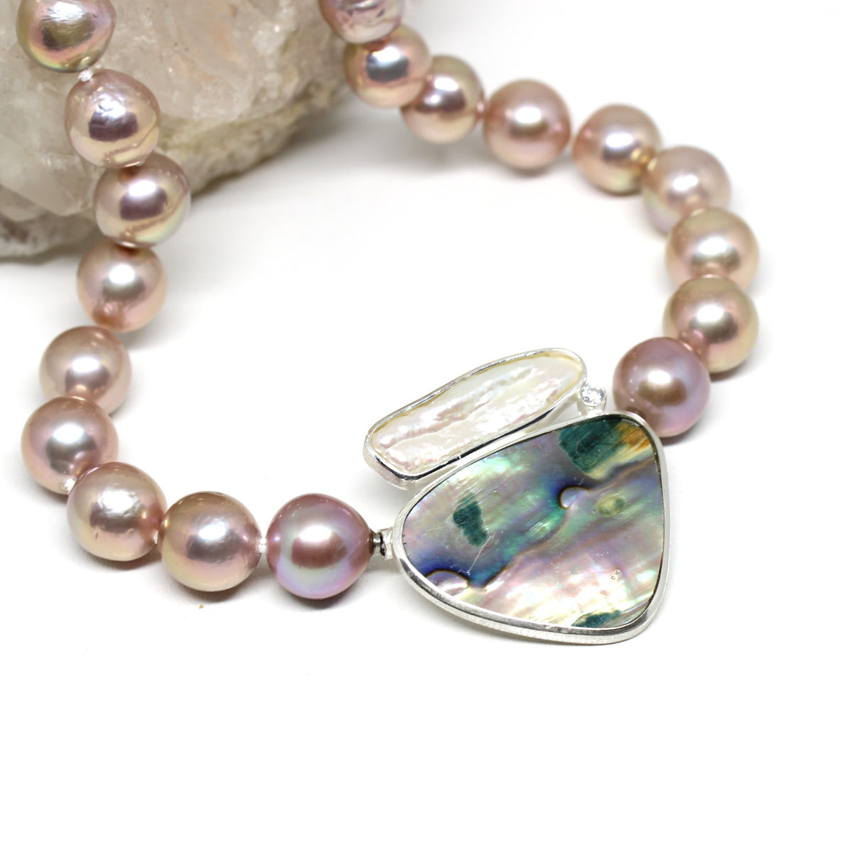 Ein echter Blickfang stellt diese handgefertigte Wechselschließe dar. Die Paoamuschel hat ein sanftes Farbspiel das an ein Aquarellbild erinnert. Als Begleiter der Muschel kommt eine weiße Süßwasserperle zum Einsatz. Diese harmoniert perfekt mit dem seidenen Glanz der Paoamuschel. Ein funkelnder Zirkonia verbindet beide Perlen. Eingefasst haben wir alles in 925er Sterlingsilber.