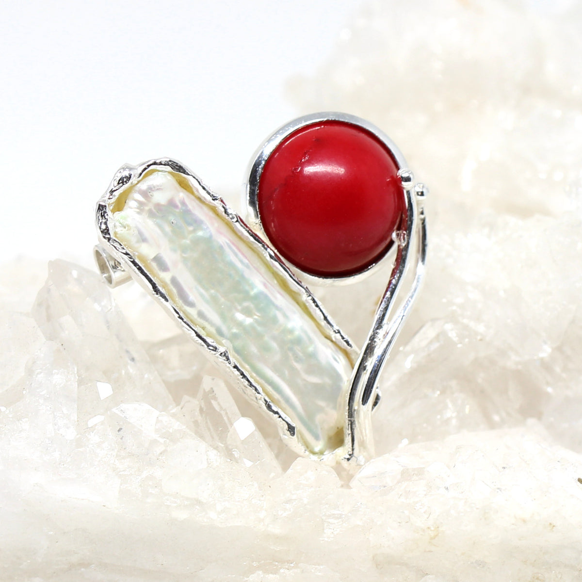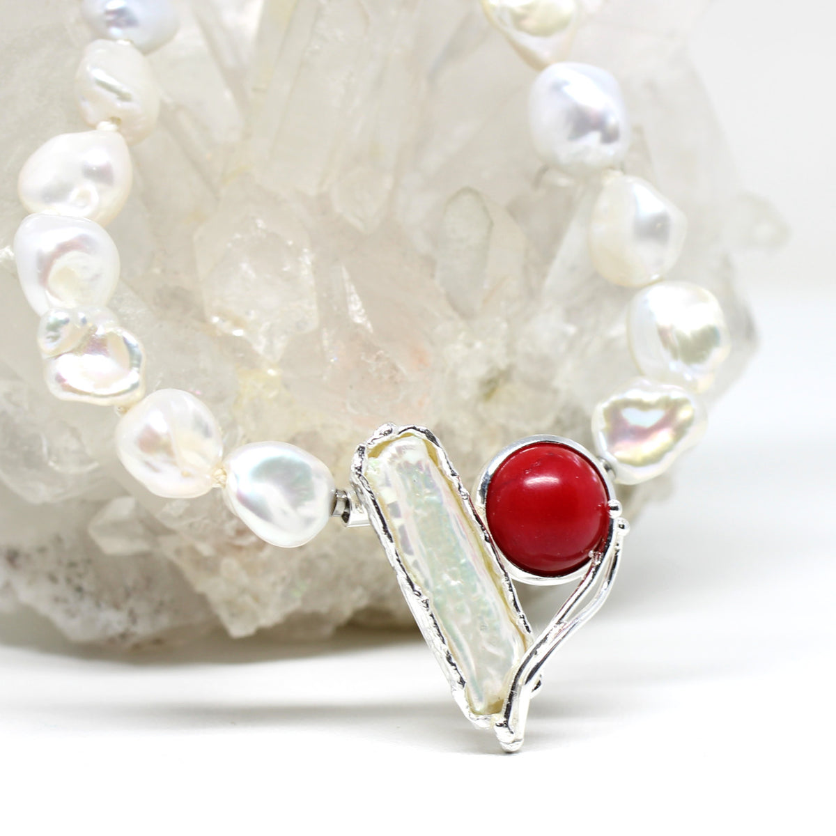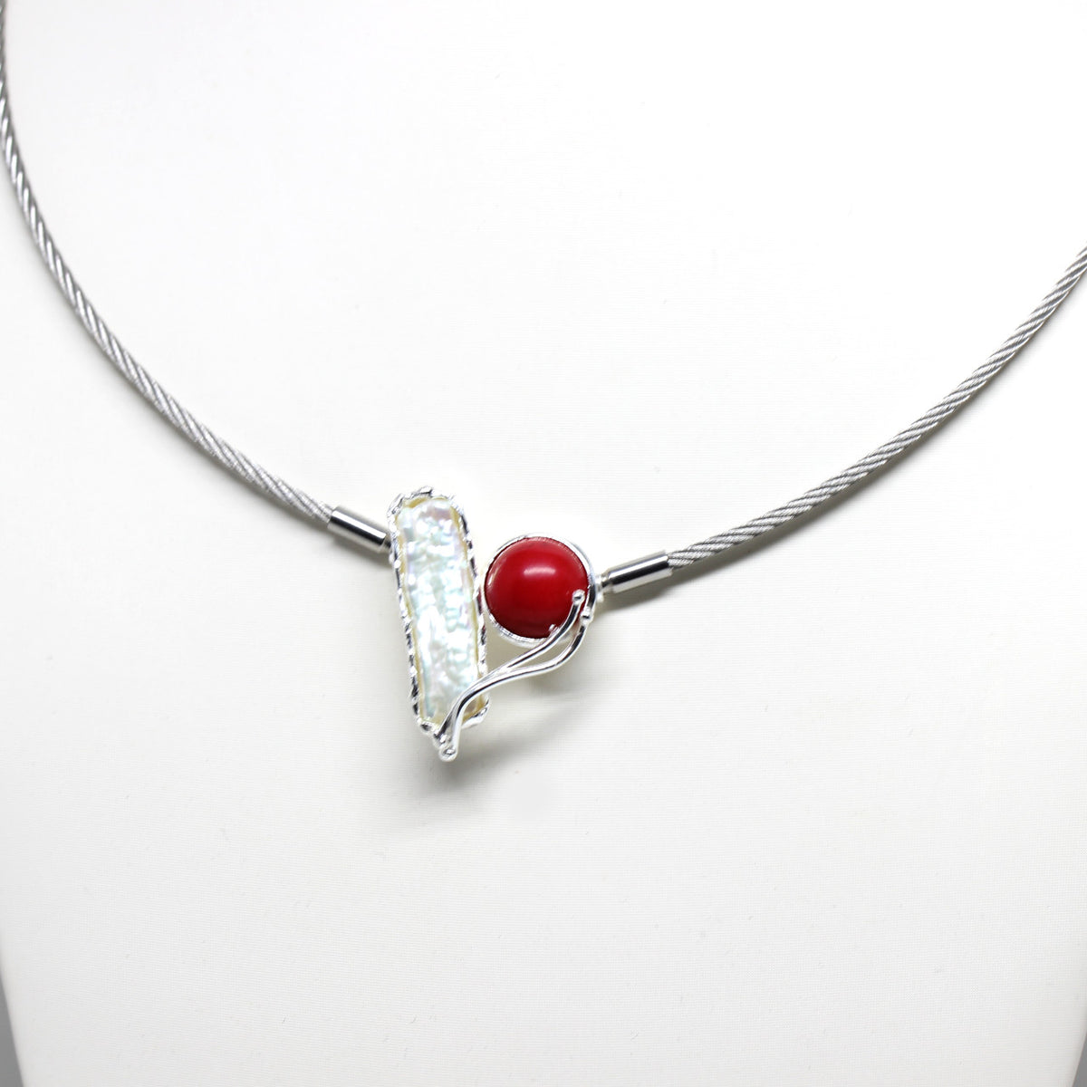 Diese handgefertigte Wechselschließe kommt gerade aus unserer Werkstatt. Sie ist aus 925er Sterlingsilber hergestellt. Das Highlight bildet hier das Zusammenspiel aus einer weißen Süßwasserperle und einer roten Bambuskoralle. Man sieht dem Schmuckstück sofort an das es ein handwerkliches Produkt ist, da es eine besondere Bearbeitungstechnik hat.