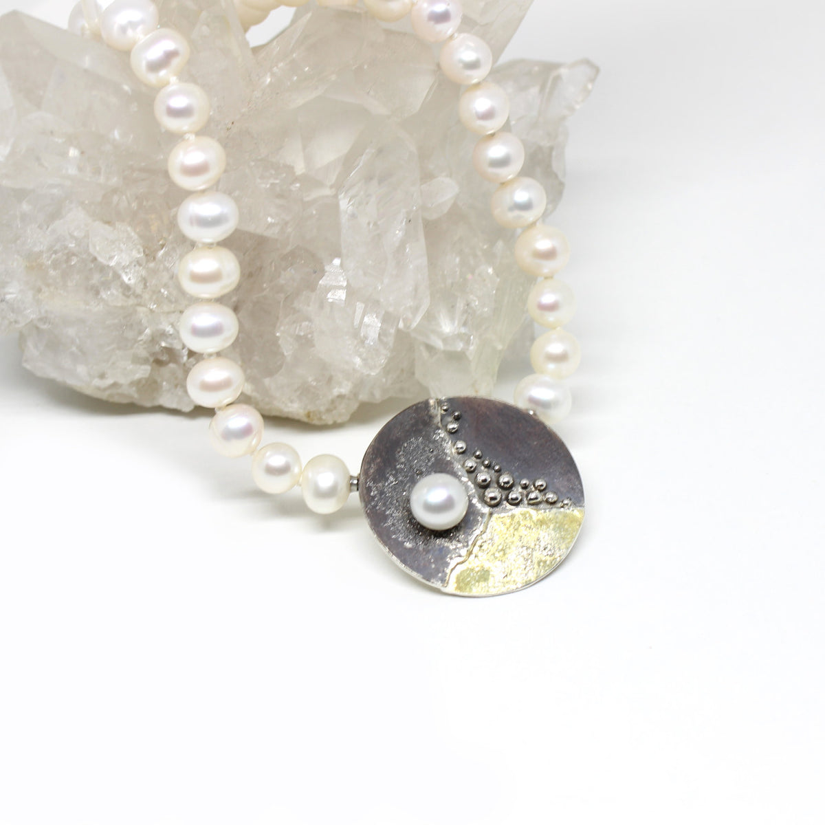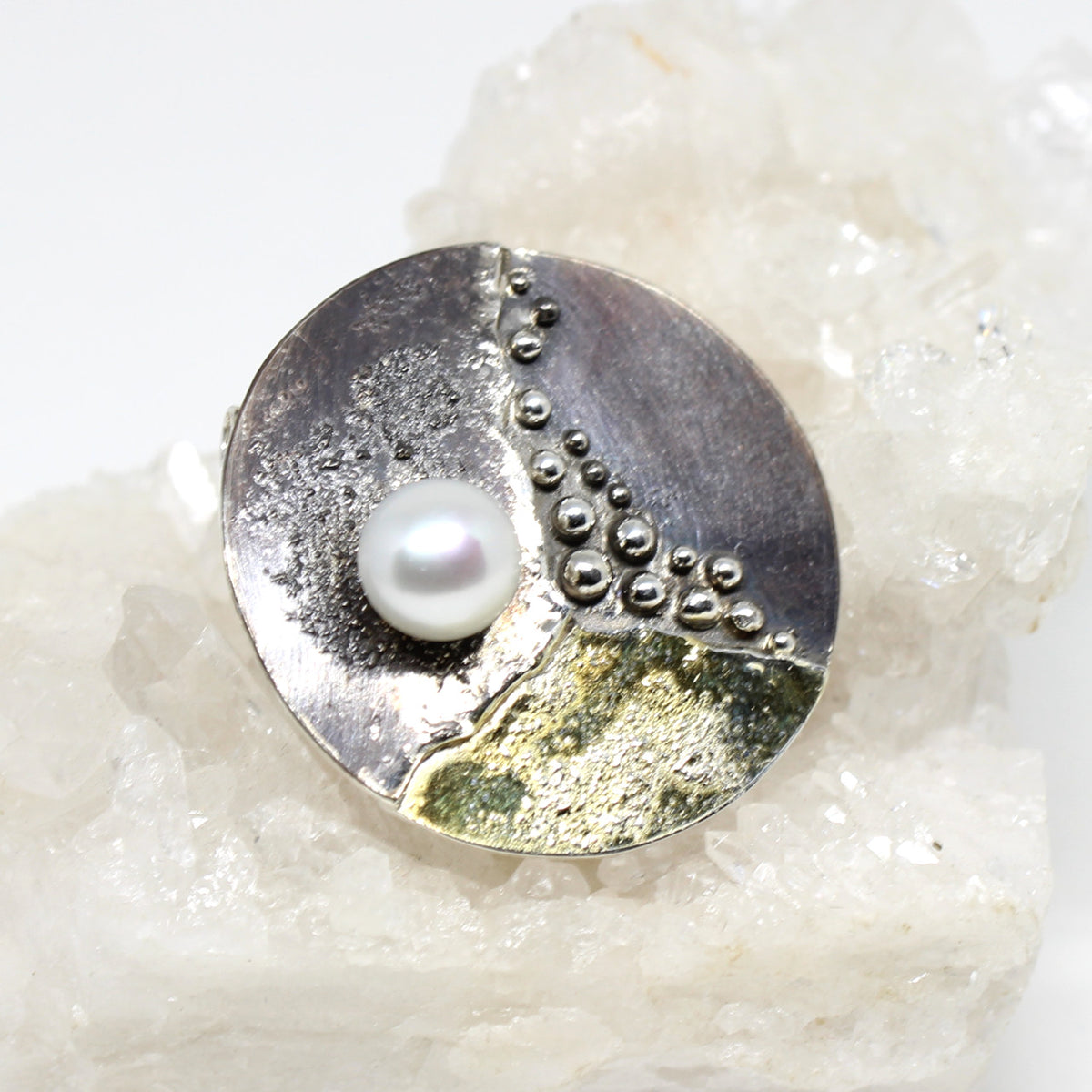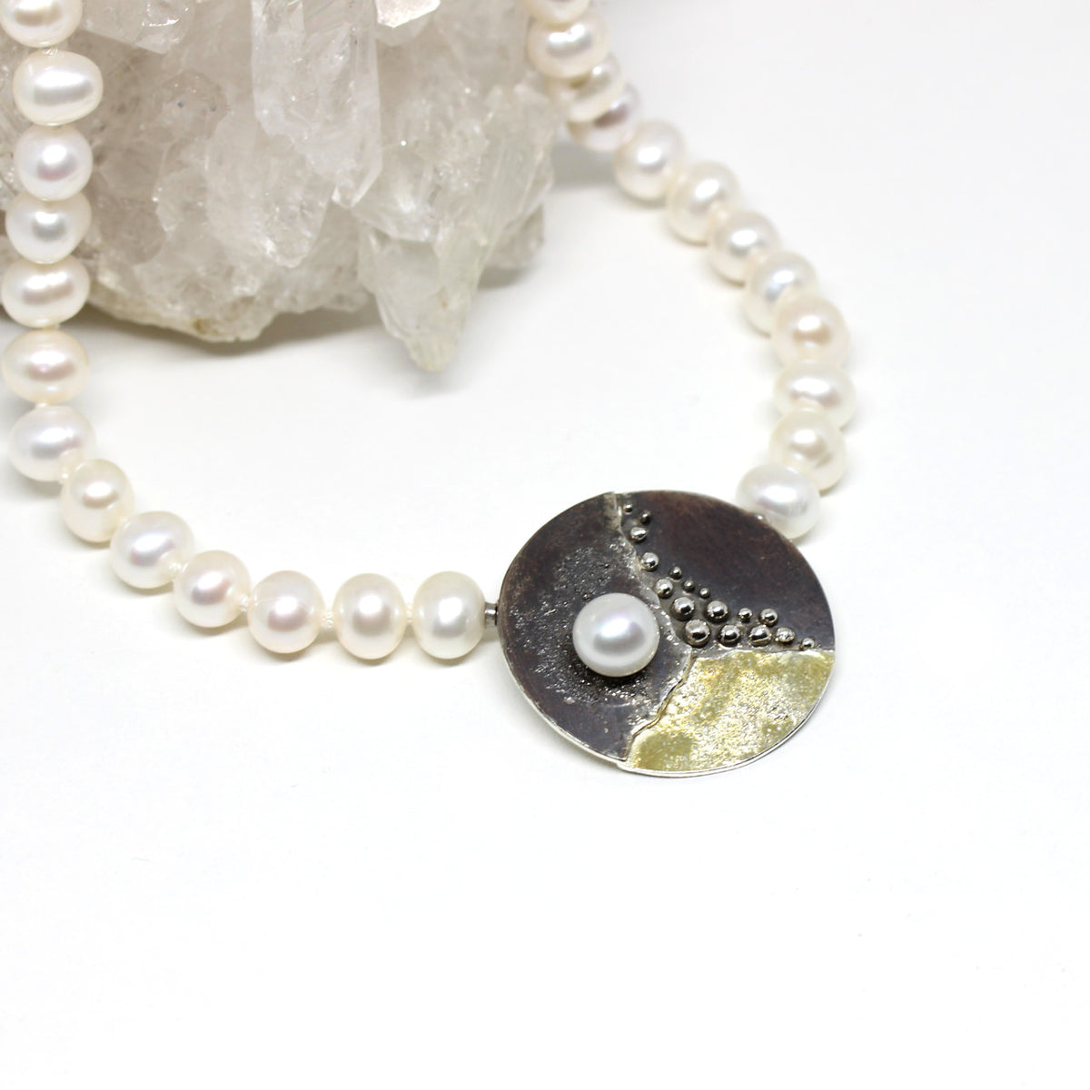 Diese neue Wechselschließe kommt gerade aus der Werkstatt! Wir waren mutig und haben hier etwas neues ausprobiert. Die Wechselschließe haben wir aus 925er Sterlingsilber geschmiedet, uns jedoch entschieden Teile des Schmuckstückes zu schwärzen und zu vergolden. Somit bekommen wir eine ganz neue Optik in unserem Sortiment. Es handelt sich hier um ein absolutes Unikat, da jede dieser Schließen komplett von Hand hergestellt sind. Eine weiße Süßwasserperle verleiht der Schließe den letzten Feinschliff.