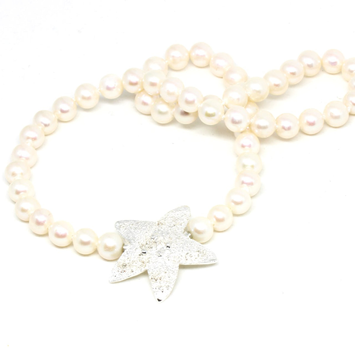 Mit dieser Schließe verbindet man automatisch Wärme und Sonnenschein. Der Seestern ist aus 925er Sterlingsilber hergestellt. Die Struktur ist rau und wild gearbeitet. Beinahe so wie bei einem echten Seestern. Wir haben ihn in unserer eigenen Werkstatt angefertigt um ihm eine individuelle Note zu verleihen. Kombiniert man dieses tolle Schmuckstück mit einer weißen Perlenkette kann der Sommer kommen.
