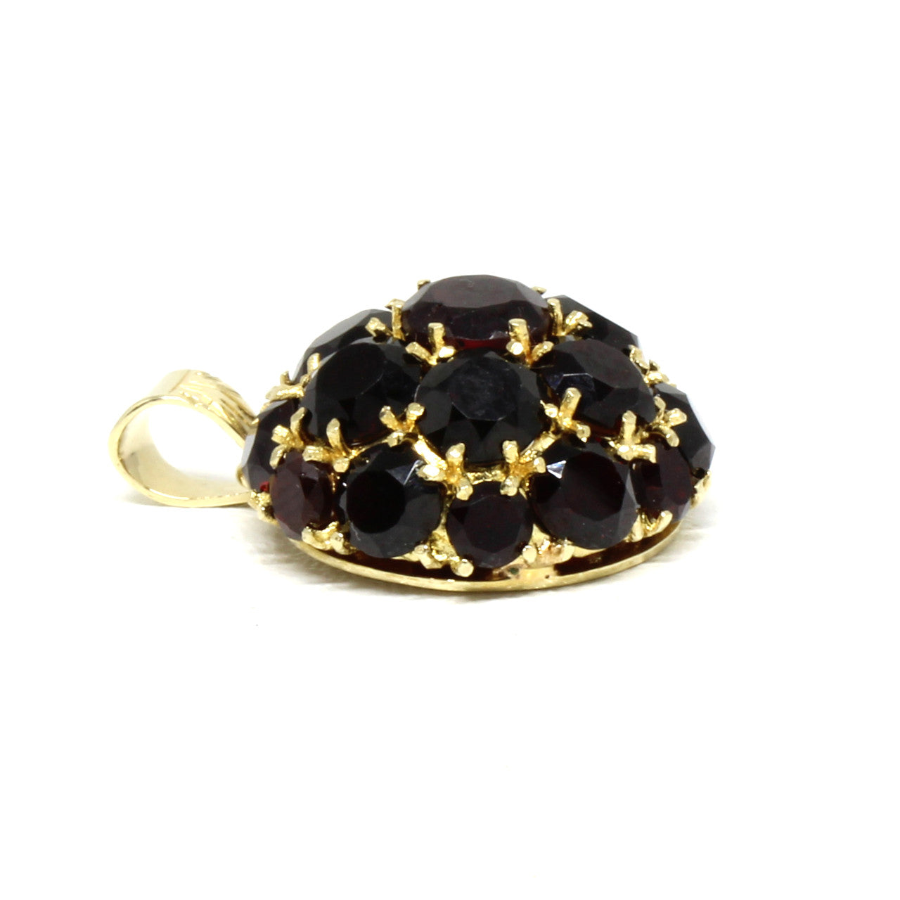 Schöner Anhänger im Vintage Stile. Das Schmuckstück ist aus 333er Gelbgold in Form einer Halbkugel hergestellt. Im Fokus stehen hier eindeutig die rotbraunen Granate. Diese harmonieren ideal mit dem Gelbgold und verleihen dem Schmuckanhänger das gewisse Etwas.