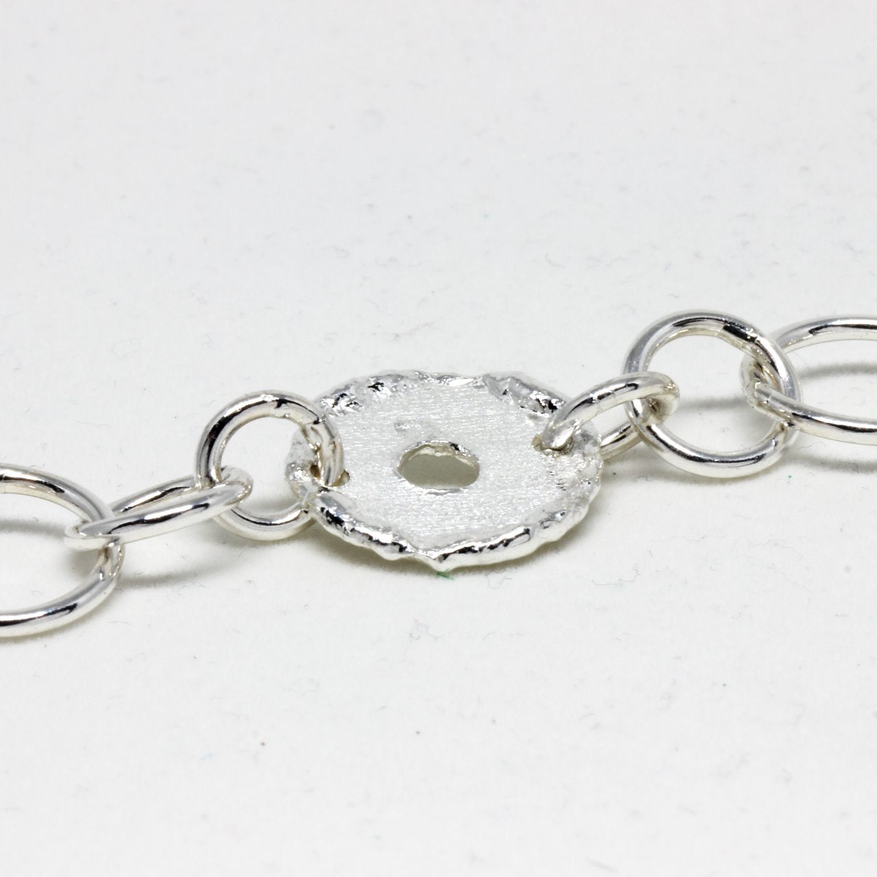 Dieses individuelle Schmuckstück ist mit viel Liebe zum Detail in unserer Werkstatt entwickelt worden. Jedes einzelne Glied und die dazugehörige Öse wurde von Hand angefertigt. Bei diesem Armband ist keinerlei Standart zu erkennen. Bei dem Armband haben wir jeweils eine Ösenkombination im Wechsel mit einem runden Ornament eingearbeitet. Die Teile sind mit unserer speziellen Technik bearbeitet und wurden anschließend mattiert. Es sind insgesamt drei dieser Teile enthalten.