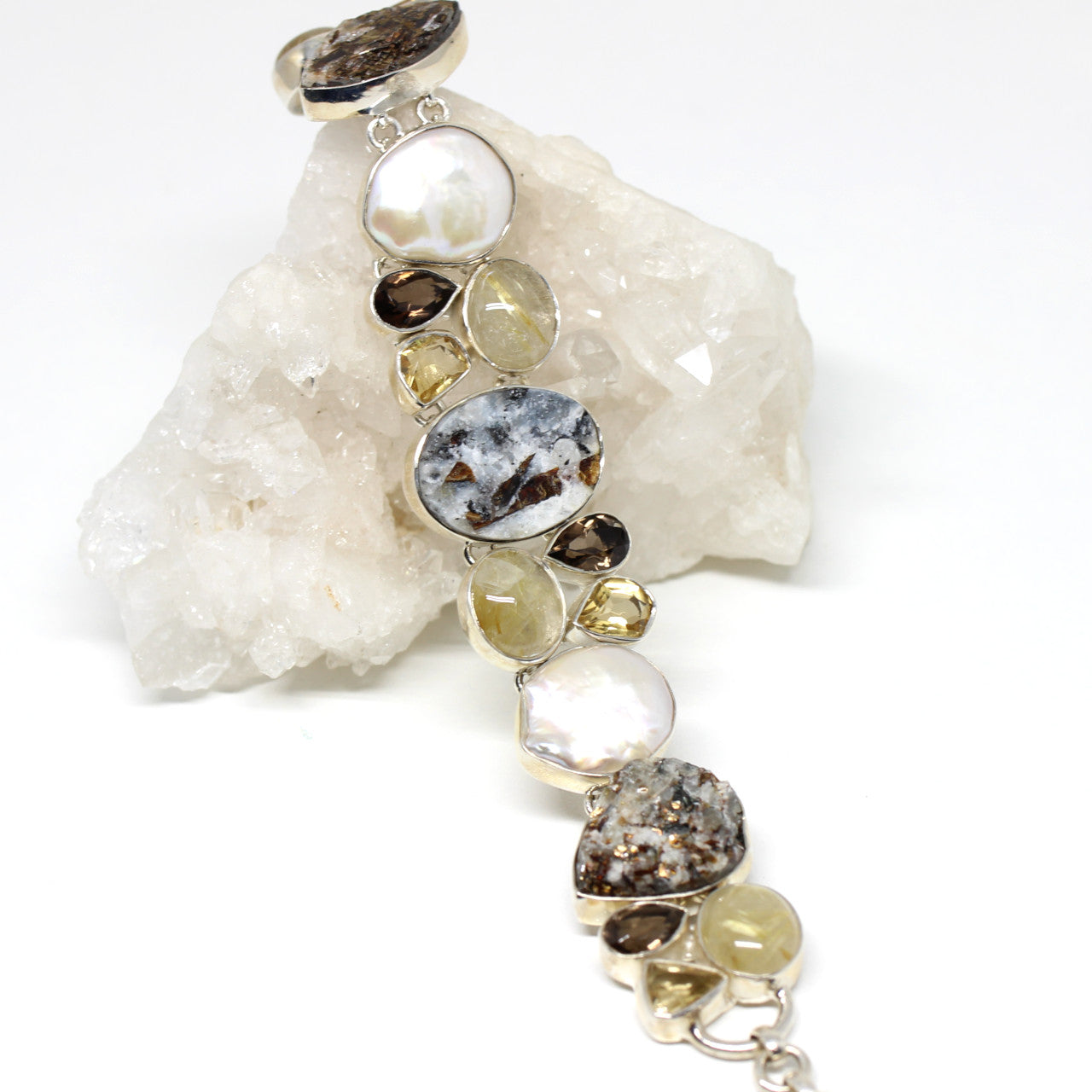 Dieses einzigartige Silberarmband ist ein echter Blickfang! Das verlockende an diesem Schmuckstück sind die unterschiedlichen Edelsteine. Sie verwandeln den Armschmuck in ein kreatives und hochwertiges Schmuckstück. Das Armband enthält einen Citrin, Rauchquarz, Rutilquarz, Süßwasserperle und einen Lemoncitrin. Der Verschluss ist ein sogenannter Knebelverschluss, bei diesem wird ein Stab durch eine Öse gesteckt.