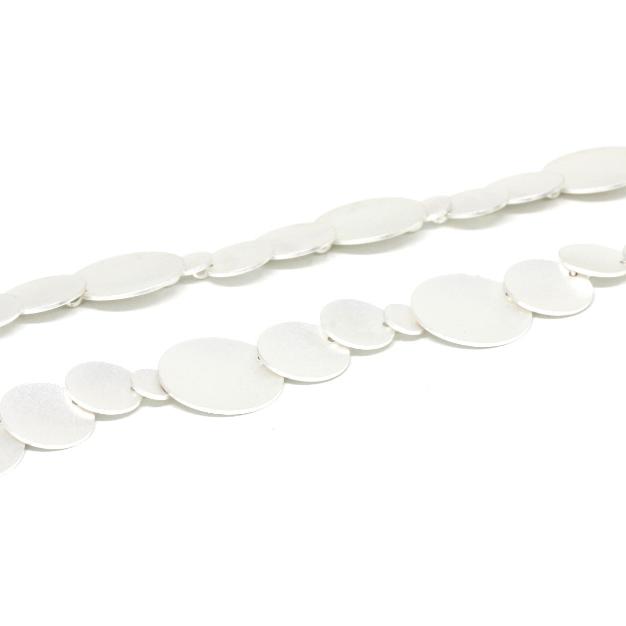 Ein traumhaftes Collier für alle, die gerne ausdrucksvollen Schmuck tragen. Die Scheiben aus unterschiedlichen Größen ziehen Blicke magisch an. Die Kette wirkt direkt mit Hautkontakt besonders gut, doch auch auf einem Pulli getragen lässt sich dieses Schmuckstück sehen. Es ist aus 925er Sterlingsilber hergestellt und hat einen Karabinerverschluss.