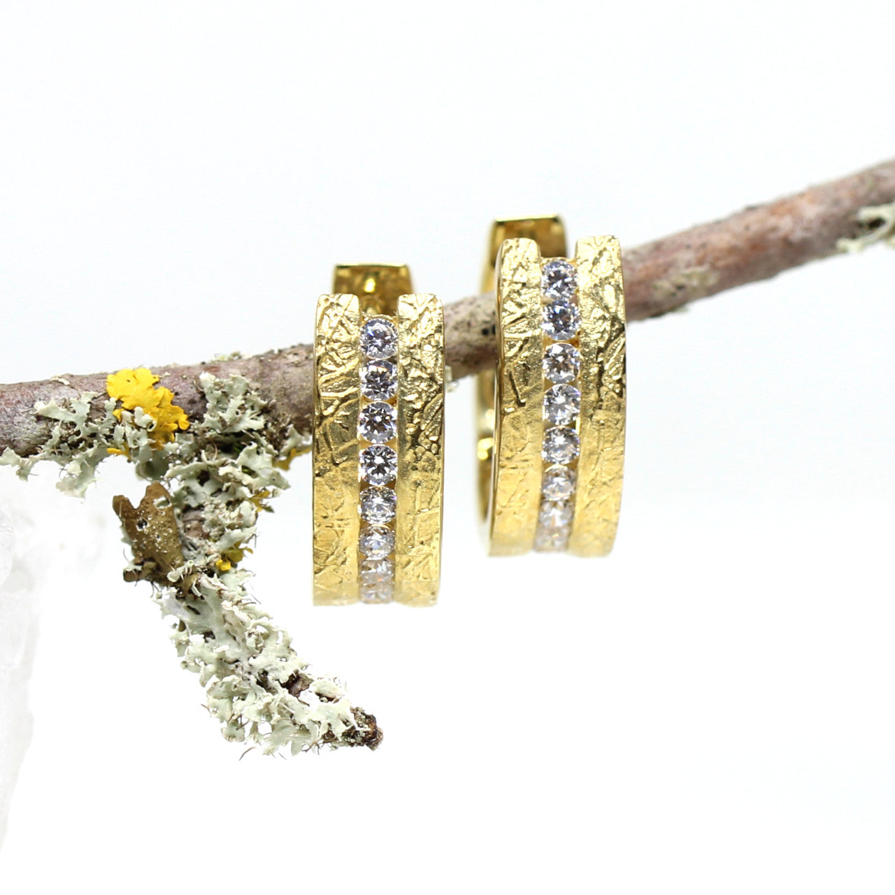 Diese ausdrucksstarken Creolen sind aus 925er Sterlingsilber und vergoldet. Die Oberfläche der Ohrringe hat eine raffinierte Struktur und umschließt funkelnde Zirkonia. Somit wirkt der Ohrschmuck sportlich und edel zugleich. Durch das Scharniergelenk und den Clickverschluß leicht zu benutzen.