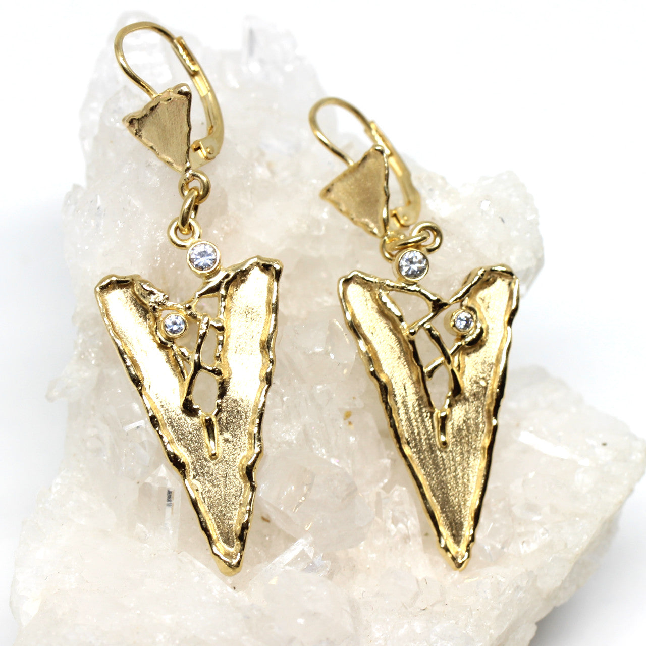 Diese individuellen Ohrhänger sind aus 333er Gelbgold gefertigt. Wir haben sie selbst entworfen und in unserer kleinen Werkstatt hergestellt. Sie sind mit kleinen Zirkonia verziert und mit unserer speziellen Oberflächenstruktur versehen. Die Verschlüsse der Ohrhänger sind aus 333er Gelbgold und mit Bügelverschluss den man verschließen kann.