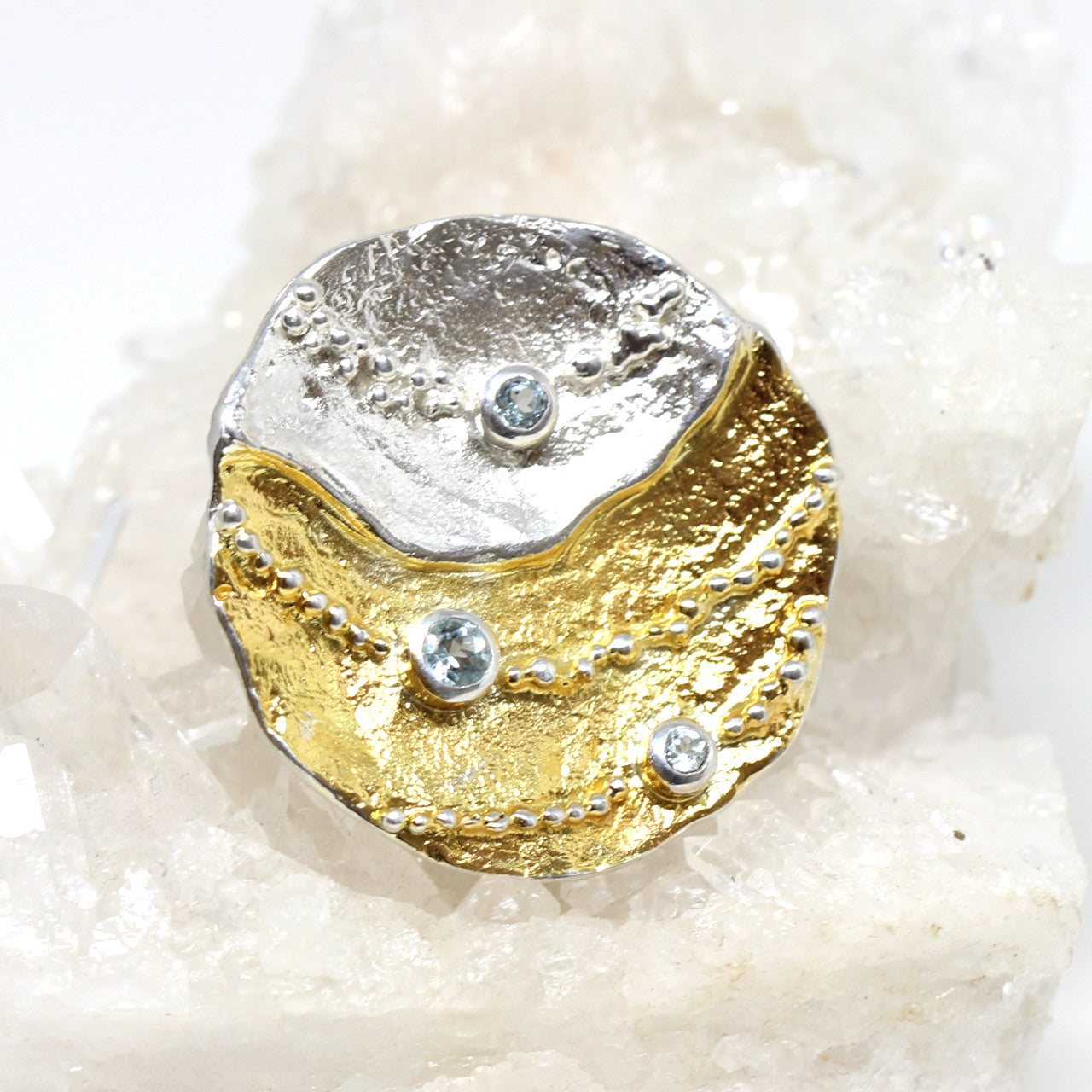 Dieser Silberanhänger ist ein absoluter Blickfang! Die zweifarbige Gestaltung verleiht ihm ein modernes und kreatives Aussehen. Die funkelnden Blautopase runden das Schmuckstück ab. Ein einzigartiger Schmuck, der dich stilvoll und elegant aussehen lässt. Als Material wurde 925er Sterlingsilber verwendet. Dieses ist teilvergoldet.