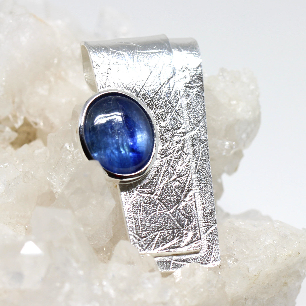 Schöner Anhänger aus 925er Sterlingsilber mit Disthen. Dieses besondere Schmuckstück ist selbst entworfen und in unserer kleinen Goldschmiede hergestellt. Mit viel Liebe zum Detail und einem bezaubernden Schmuckstein ist ein Stück entstanden, das sich besonders gut zu Jeanskleidung tragen lässt. Der Disthen ist ein in verschiedenen Blauschattierungen schimmernder Halbedelstein. Kombiniert mit dem Sterlingsilber ist dies ein wundervolles Schmuckstück, das man zu jedem Anlass super tragen kann.