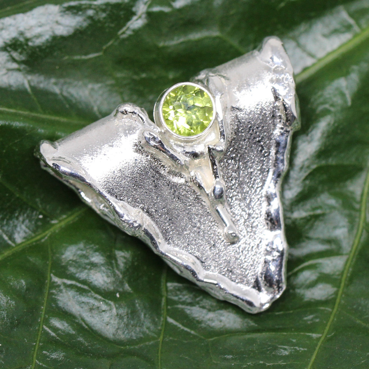 Dieser sportlich gearbeitete Silberanhänger ist genau das richtige für Ihren Freizeitlook. Man kann ihn hervorragend in einer schwarzen Lederkette tragen, aber auch in einer Silberkette sieht er einfach klasse aus. Er ist aus 925er Sterlingsilber gefertigt und mit unserer speziellen Oberflächenstruktur versehen. Als Blickpunkt haben wir einen funkelnden Peridot in frischem grün eingefasst. Die Kombination aus einer klaren Form und individueller Handwerkskunst macht diesen Silberanhänger zu einem besonders schönen Schmuckstück das in keinem Schmuckkästchen fehlen sollte.
