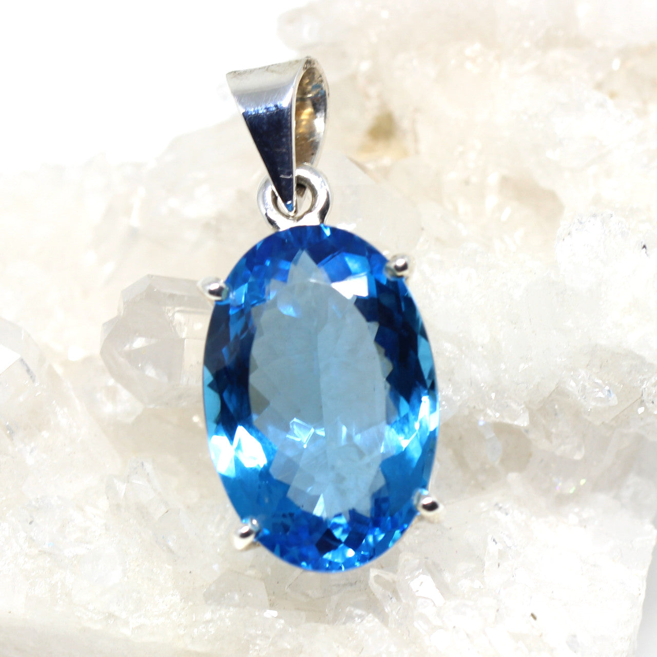 Dieses elegante Schmuckstück beeindruckt vor allen Dingen mit seinem Blautopas. Die Farbe des Steines ist sehr intensiv und ein Zeichen der Hochwertigkeit des Edelsteines. Der Schliff des Topases spiegelt eine besondere Tiefe welche hervorragend zu dem blauen Topas passt. Eingefasst ist der Edelstein in 925er Sterlingsilber. Der Stein wurde weitestgehend in seiner Form belassen, da er so am besten zur Geltung kommt.