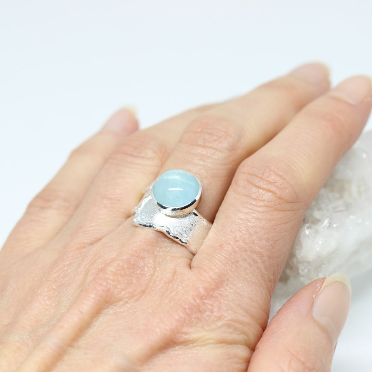Toller Ring aus 925er Sterlingsilber der in unserer Werkstatt hergestellt wurde. Den Mittelpunkt schmückt ein Aquamarinstein. Wie der Name des Steines schon verrät erinnert die Farbe an Wasser. Vor allem zu dem Silber sieht der Aquamarin sehr edel aus. Ein weiterer Blickfang ist die schöne Struktur die wir in das Metall eingearbeitet haben. Dadurch bekommt dieses Stück noch mehr Kreativität.