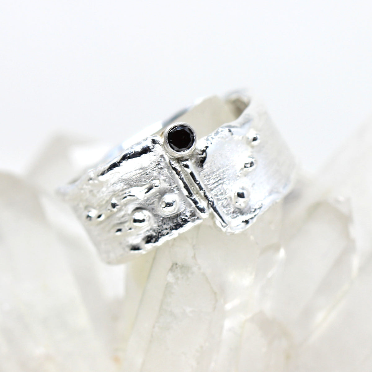 Dieser schöne, aufregende und zeitlose Ring ist unserer Goldschmiede entstanden. Wir haben ihn aus 925er Sterlingsilber geschmiedet und mit einem schwarzen Diamanten verziert. Der Stein erstrahlt in edlen Kontrast zu dem mattierten Silber und macht diesen Ring zu einem besonderen Schmuckstück.