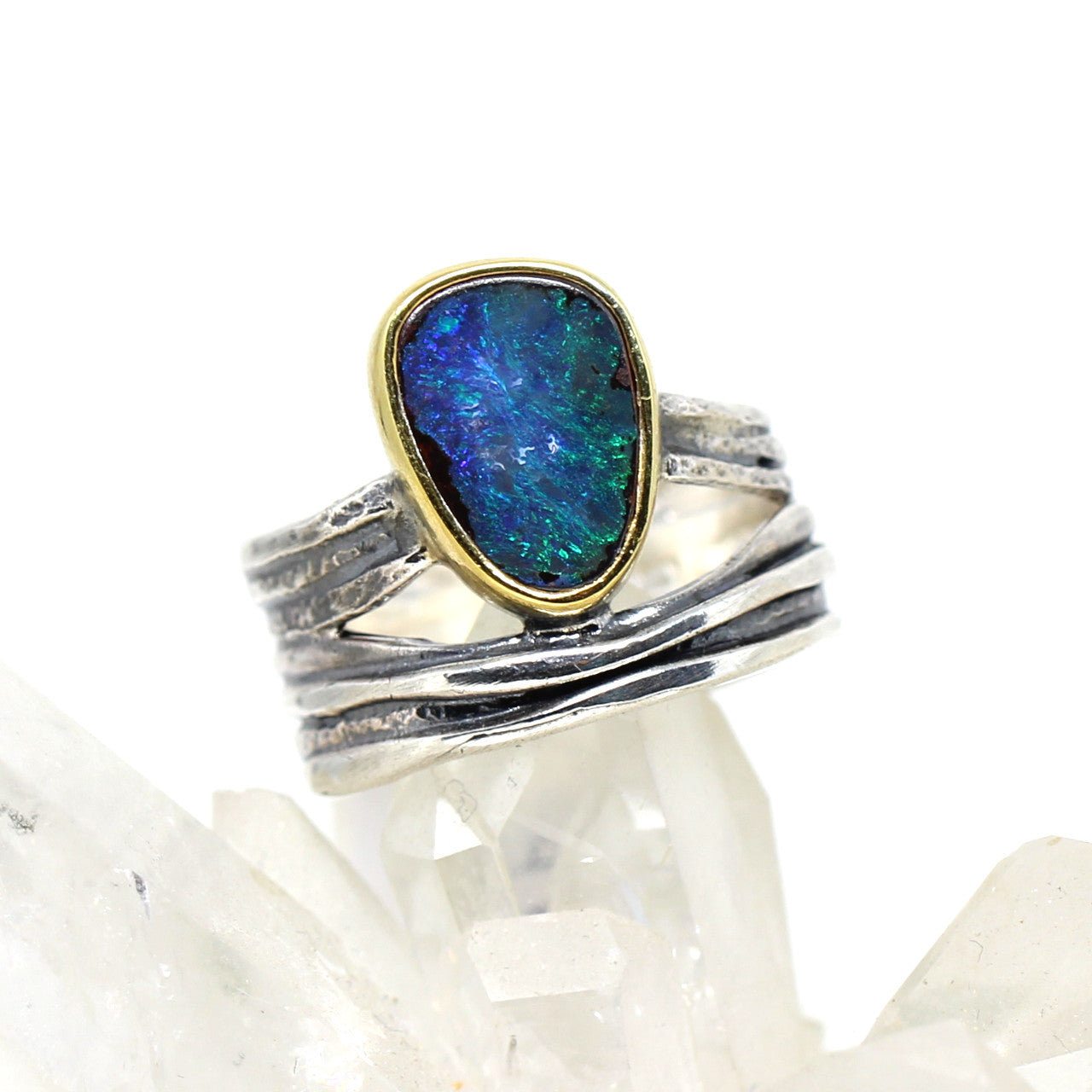 Dieses Schmuckstück ist ein Traum für jeden Opalfan. Der lebhafte Edelstein ist ein absoluter Blickfang und sieht einfach umwerfend aus. Der Ring besteht aus 925er Sterlingsilber und ist geschwärzt. Die Einfassung des Opals ist silbervergoldet.
