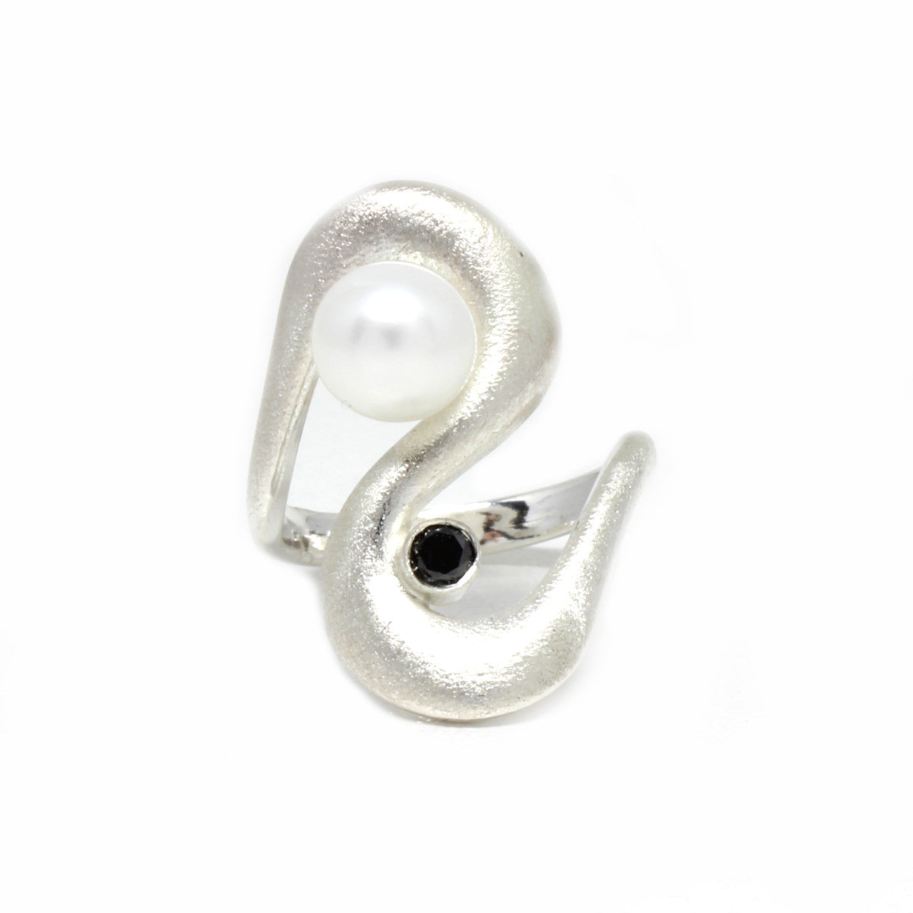 Diesen stylischen Ring haben wir in unserer kleinen Manufaktur hergestellt. Das Schmuckstück ist aus 925er Sterlingsilber geschmiedet und die Oberfläche mattiert. Als Besonderheit haben wir einen schwarzen Diamanten und eine Süßwasserperle eingefügt. Diese Komponenten erzielen einen tollen Kontrast zu dem Sterlingsilber.