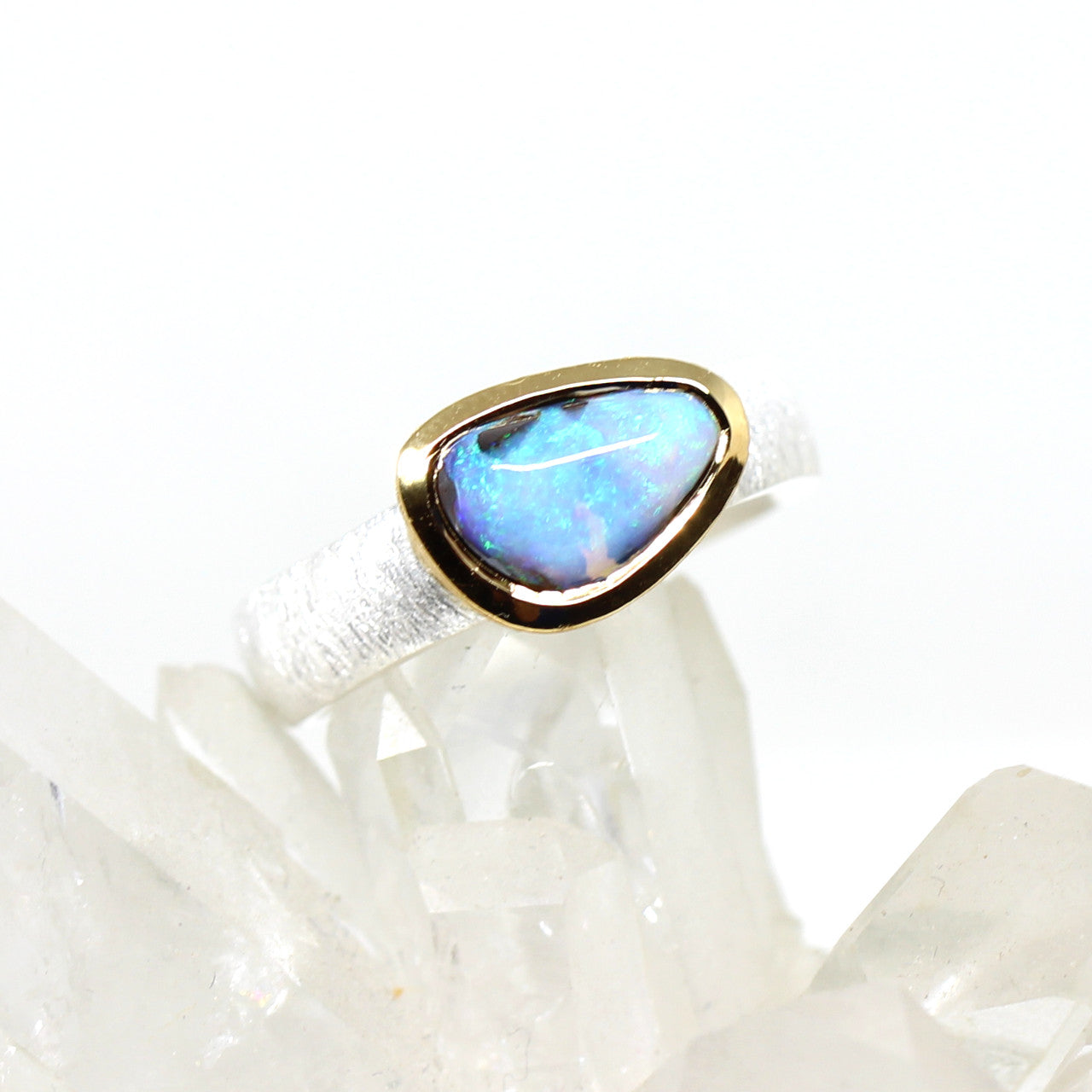 Dieses Schmuckstück ist ein Traum für jeden Opalfan. Der lebhafte Edelstein ist ein absoluter Blickfang und sieht einfach umwerfend aus. Der Ring besteht aus 925er Sterlingsilber und ist rundum eismattiert. Die Einfassung des Edelsteines ist vergoldet und verleiht dem Ring zusätzliche Eleganz.