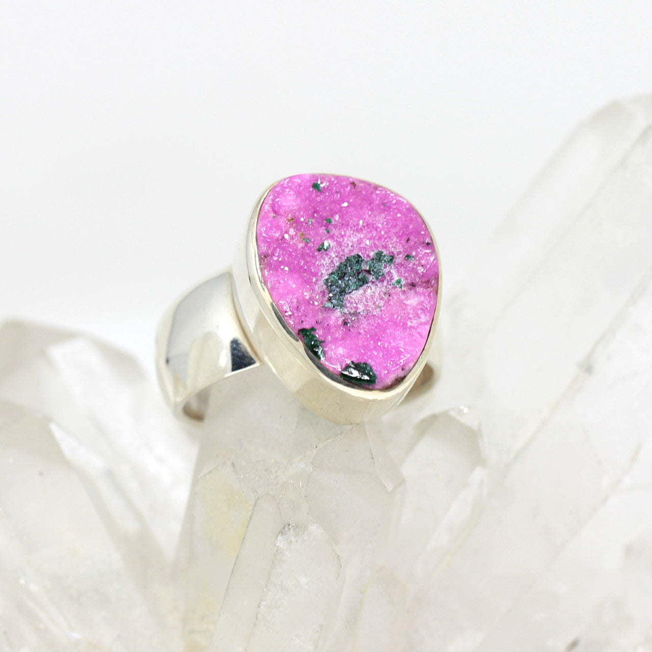 Mit diesem Schmuckstück zieht gute Laune ein! Der intensive Farbton des Kobaltcalcites ist ein echter Blickfang. Die unzähligen kleinen Kristalle leuchten im Sonnenlicht. Bei diesem wunderschönen Stein haben sich kleine Malachiteinlagerungen gebildet. Der Kobaltcalcit ist nicht gefärbt, er hat von Natur aus diesen unverkennbaren Farbton. Der Ring ist aus 925er Sterlingsilber hergestellt und poliert.