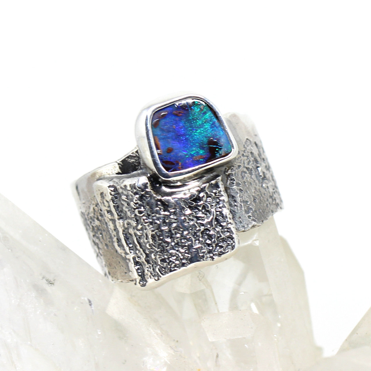 Dieses Schmuckstück ist ein Traum für jeden Opalfan. Der lebhafte Edelstein ist ein absoluter Blickfang und sieht einfach umwerfend aus. Der Ring besteht aus 925er Sterlingsilber und ist geschwärzt. Er hat eine sehr besondere Oberflächenstruktur und ist ein absolutes Unikat!