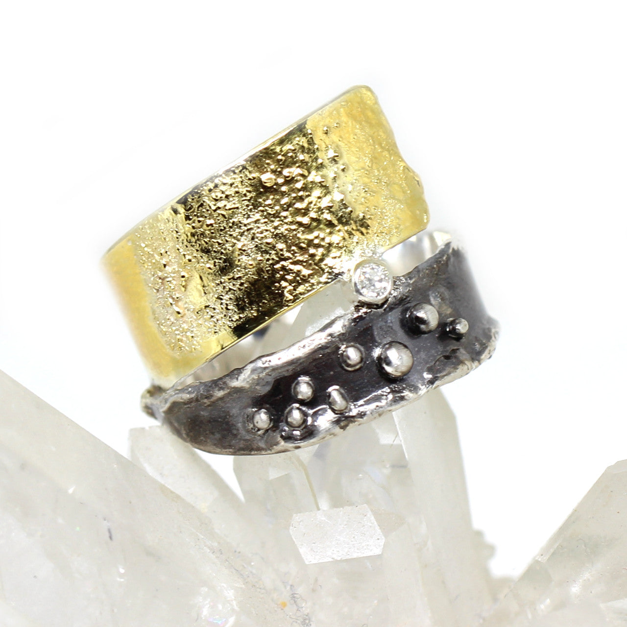 Dieses kreative Schmuckstück ist ein echter Blickfang! Die spezielle Oberflächenbearbeitung lässt ihn handwerklich und filigran zugleich wirken. Das Material ist 925er Sterlingsilber welches teilweise geschwärzt und vergoldet wurde. Ein funkelnder Brilliant rundet das ganze ab.