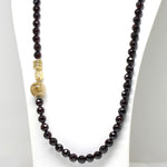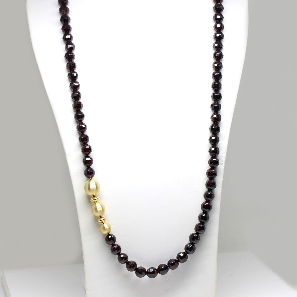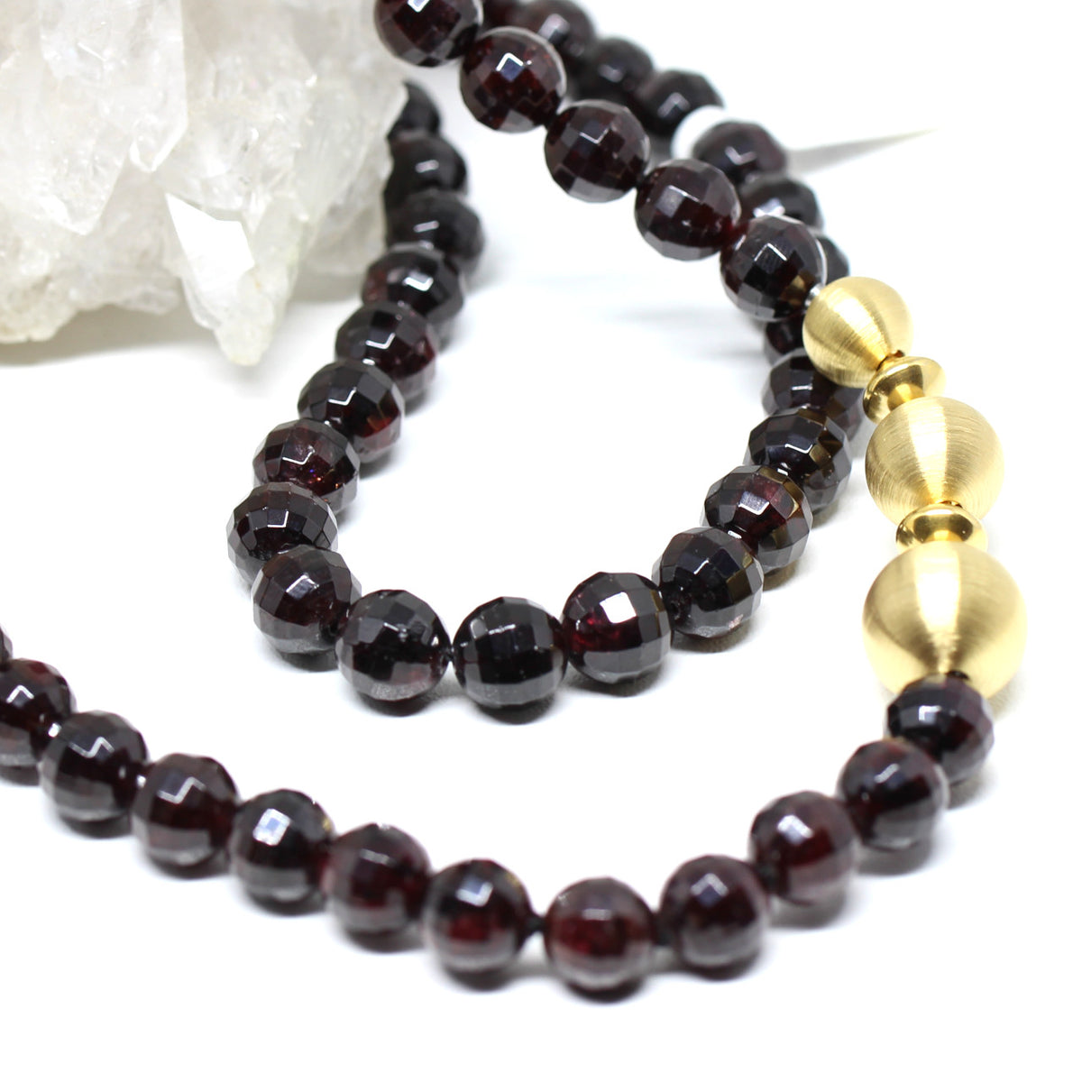 NEU! Diese attraktive Wechselkette haben wir in einer Sonderlänge von 79 cm hergestellt. Gerade jetzt im Winter eignet sich dieses Modell ideal für dicke Rollkragenpullover. Durch das eingearbeitet Wechselsystem kannst du beliebig deine Schließen einfügen persönliche Highlights setzen! Noch ein paar Worte zum Edelstein Granat; er zählt wohl zu einem der bekanntesten Edelsteine der Welt. Seine markante Farbe aus rot und braun macht ihn unverkennbar. Auch die Eigenschaften des Granates sind hervorragend und stehen für Freude und Lebenskraft. Verstärkt wird der Ausdruck dieser Wechselkette durch die facettierten Steinkugeln.