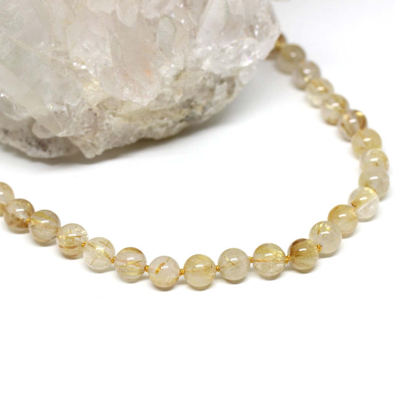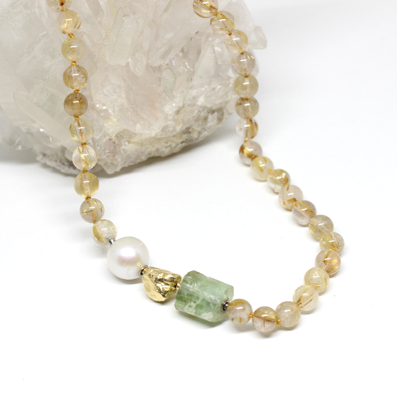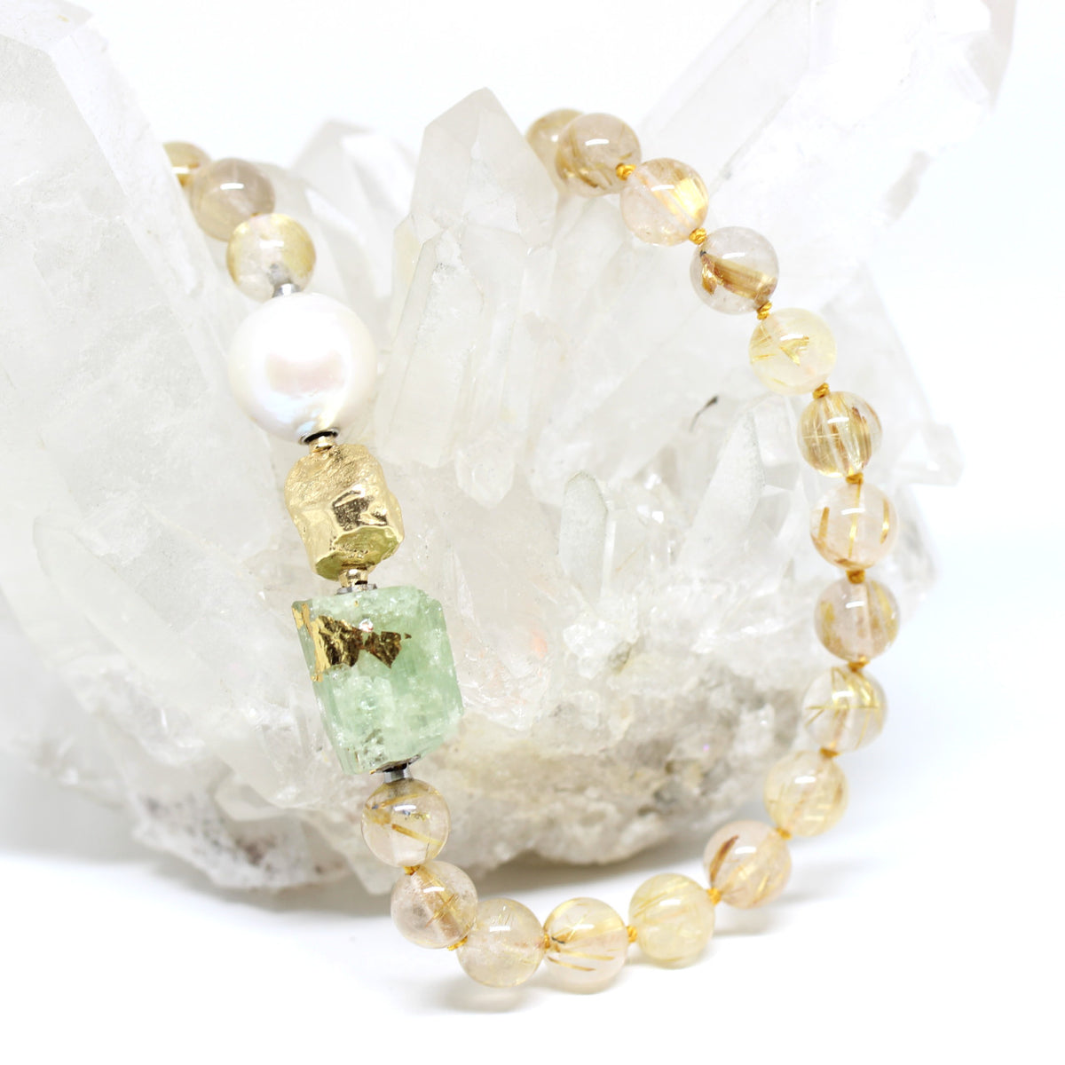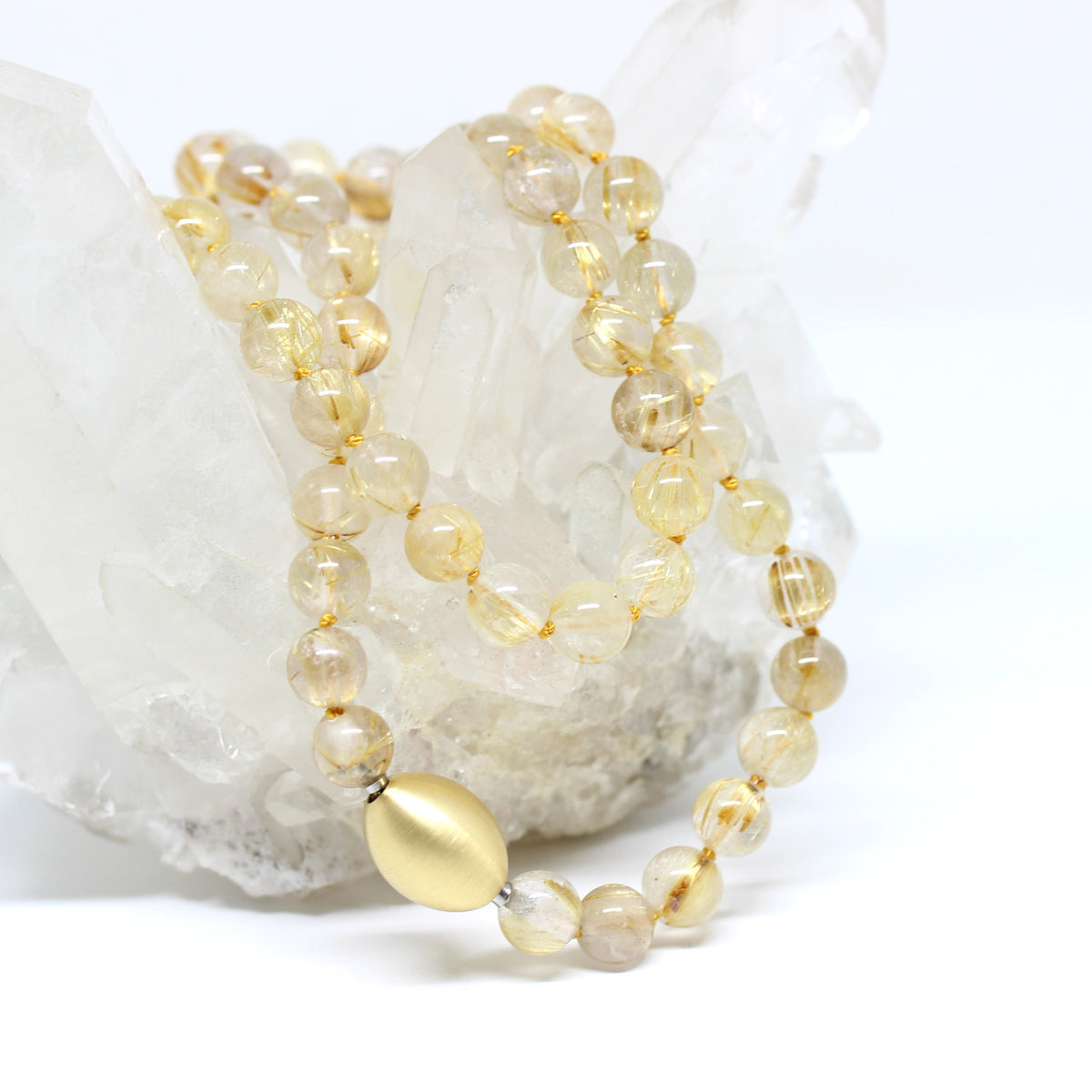 Diese zauberhafte Wechselkette passt ausgezeichnet zu goldenen Wechselschließen. Die goldfarbenen Nadeln wirken glamourös in dem durchscheinenden Bergkristall. Diese Wechselkette ist ein absoluter Eyecatcher und ein atemberaubendes Schmuckstück. Der Rutilquarz steht für Hoffnung und Unabhängigkeit. Man sagt ihm nach er würde stimmungsaufhellend wirken.
