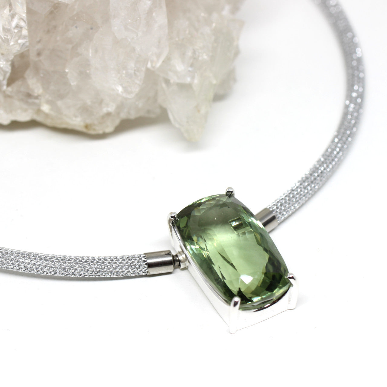 Der grüne Amethyst bereichert seit eben erneut unser Sortiment. Der Schliff des Edelsteines verleiht ihm einen magischen Ausdruck. Man muss diesen Stein von allen Seiten betrachten und bekommt das Gefühl nicht mehr weg sehen zu können. Der Amethyst hat eine besondere Schliffart bei der eine gewisse Tiefe entsteht. Der Stein bekommt Leben eingehaucht. Eingerahmt ist der grüne Edelstein von 925er Sterlingsilber. Das Edelmetall wurde auf hochglanz poliert und unterstreicht somit die Hochwertigkeit des grünen Amethystes.