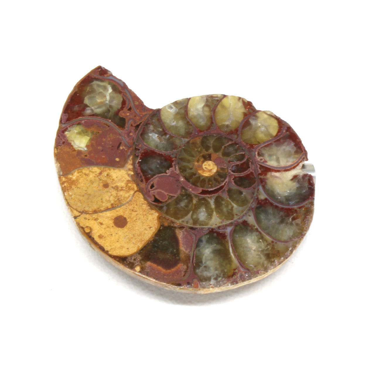 Ein Ammonit in Sonderoptik! Die Frabe des Edelsteines hat eine Mischung aus braun und grün. Diese Farbe sehen wir nicht häufig bei den Ammoniten. Auch das Schneckenmuster ist bei diesem Stein sehr gut ausgeprägt. Zwei stellen sind in einem hellen Braunton, dort sieht man das Muttergestein. Dieses setzt mit seiner matten Oberfläche einen sagenhaften Kontrast zu der ansonsten polierten Oberfläche.