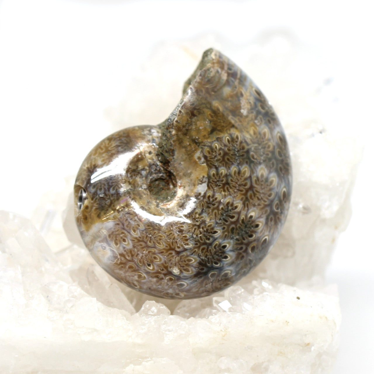 Diese außergewöhnliche Ammonitschließe ist ein absolutes Unikat. Die Schnecke hat ein Muster, als wäre es aus Blättern zusammengesetzt. Es handelt sich hier um ein Naturprodukt der besonderen Art.