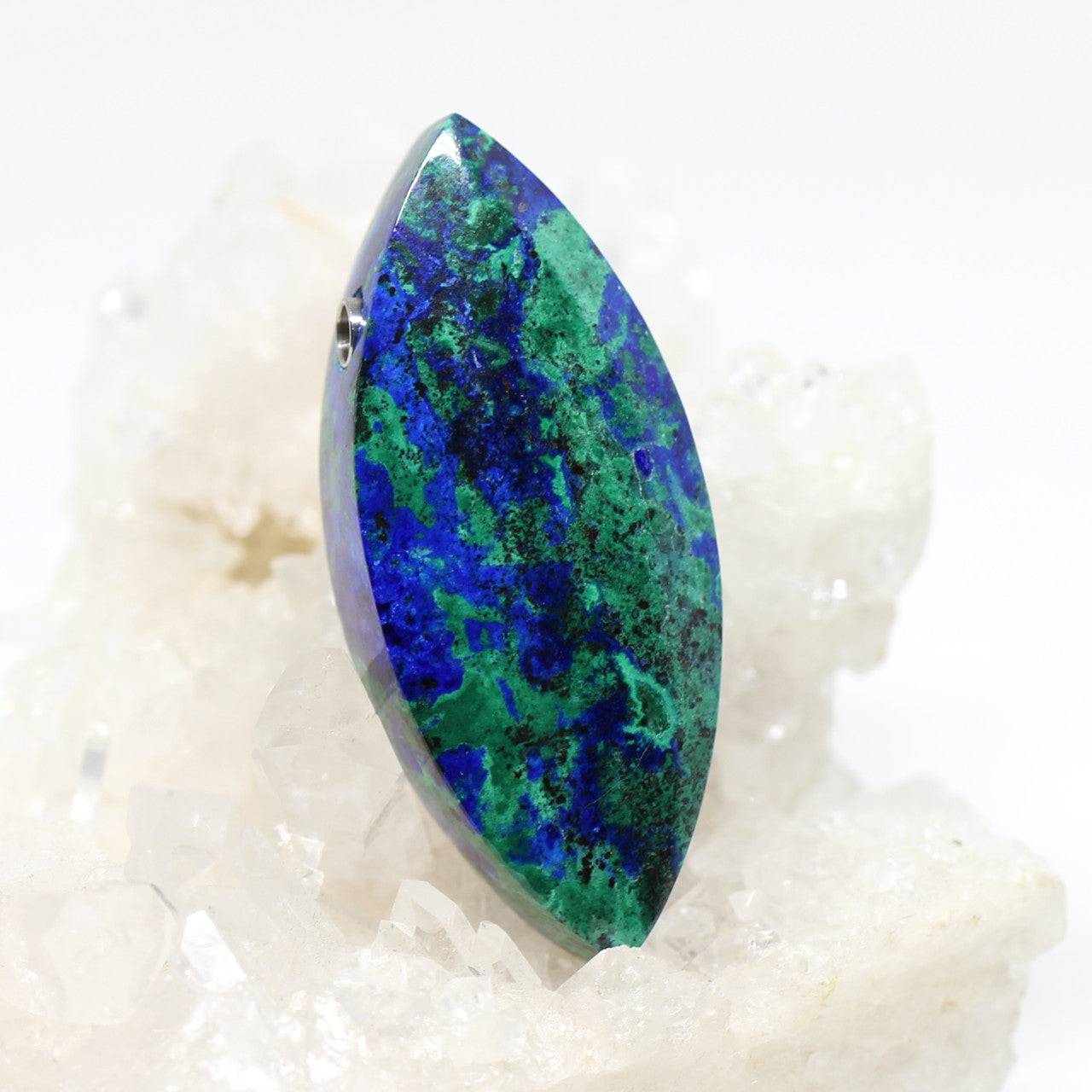 Der Azurit ist ein Edelstein mit vielen Gesichtern. Die dominanten Farben gestalten immer neue, phänomenale Wechselschließen. Bei diesem besonderen Stück steht das Malachitanteil im Vordergrund. Dieses wird von knalligem Azurit durchzogen und bildet somit eine traumhafte Wechselschließe. Dieses Schmuckstück ist zum verlieben.