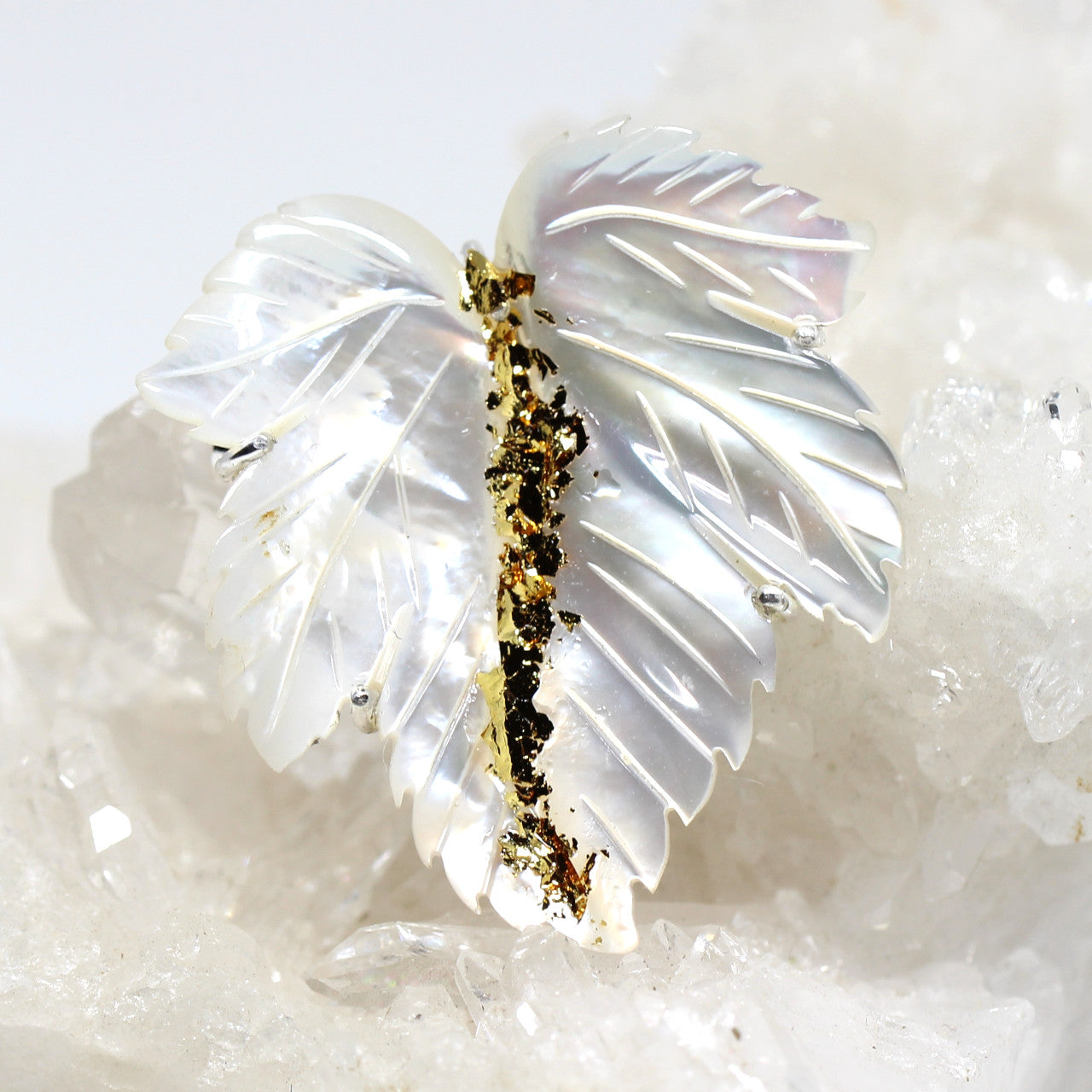 Dieses spektakuläre Blatt ist aus Perlmutt. Diese einmalige Wechselschließe ist von uns in 925er Sterlingsilber eingefasst. Als Highlight haben wir etwas Blattgold aufgearbeitet.