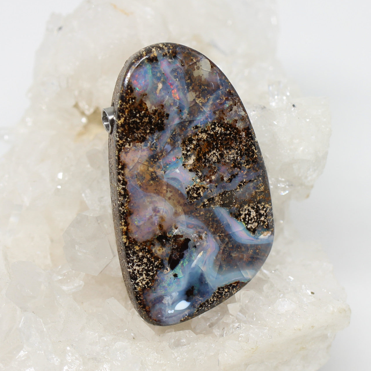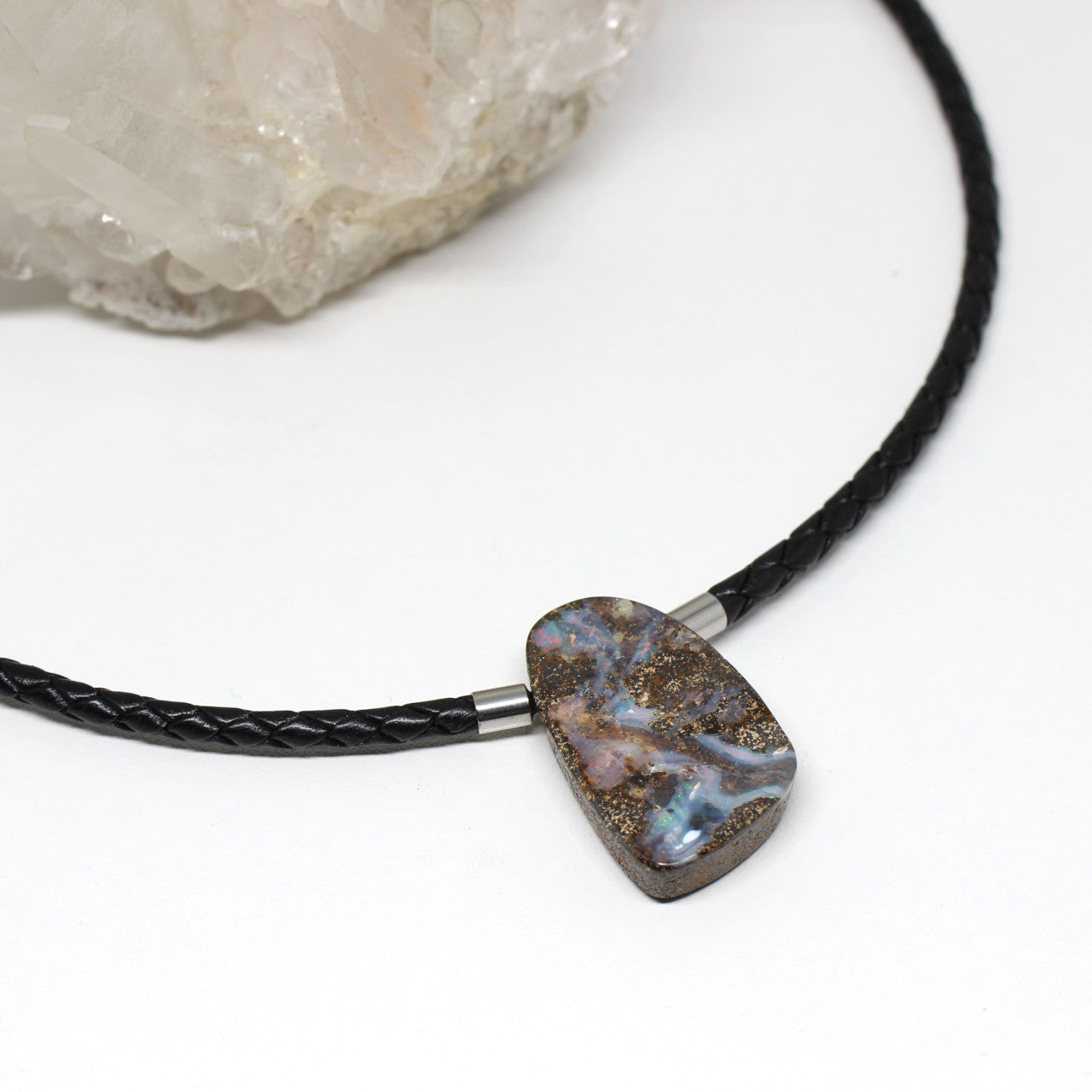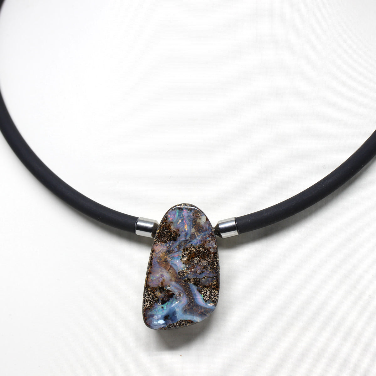 Ein weiteres Unikat haben wir als Wechselschließe gearbeitet. Auch bei diesem tollen Boulderopal handelt es sich um ein Stück direkt aus Australien. Der Regenbogenartige Opal ist umringt von Muttergestein und es scheint wie ein kleines Gemälde. Als ob sich kleine Bäche durch die Landschaft ziehen. Es ist wie immer eine Faszination der Opale wie einzigartig sie sind.